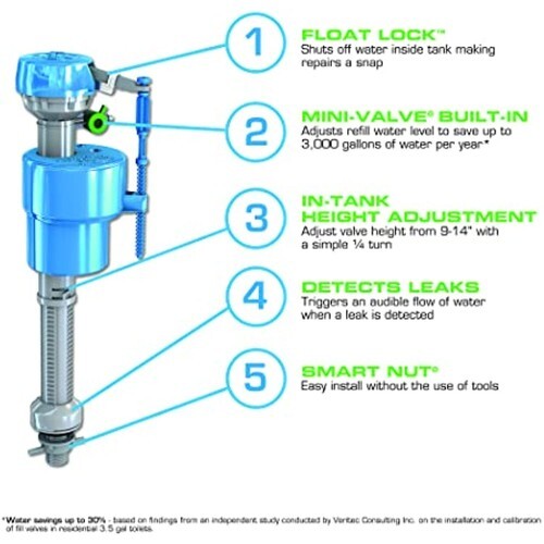 Water-saving toilet fill valve with float lock. Mini-valve calibrates water volume. Make in-tank repairs without turning off the water. Installs easily without tools. Height adjusts from 11 in. to 13.8 in.. Eco Options certified. The Water-Saving Fill Valve calibrates the amount of water being sent to the bowl during the tank refilling process, thus helping to save the amount of water used. It also detects leaks and signals when a leak is found.
