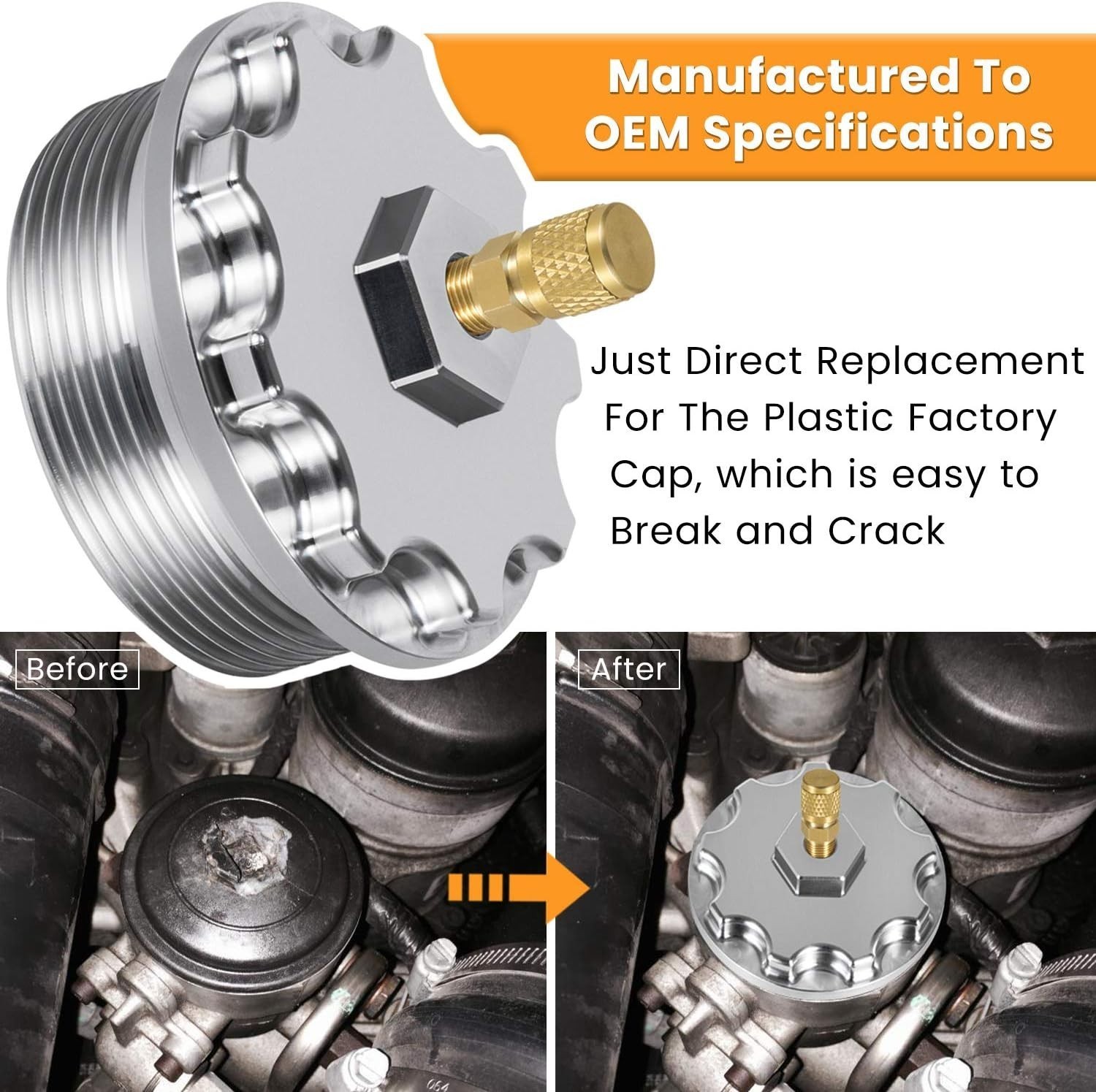 Manufactured to OEM specifications. Direct replacement for The Old Plastic Factory Cap (OEM # 3C3Z-9G270-AA), which is easy to break and crack. Comes with schrader vavle, so you can tap right in to measure fuel pressure. Never worry about cracking your factory plastic fuel filter cap again!