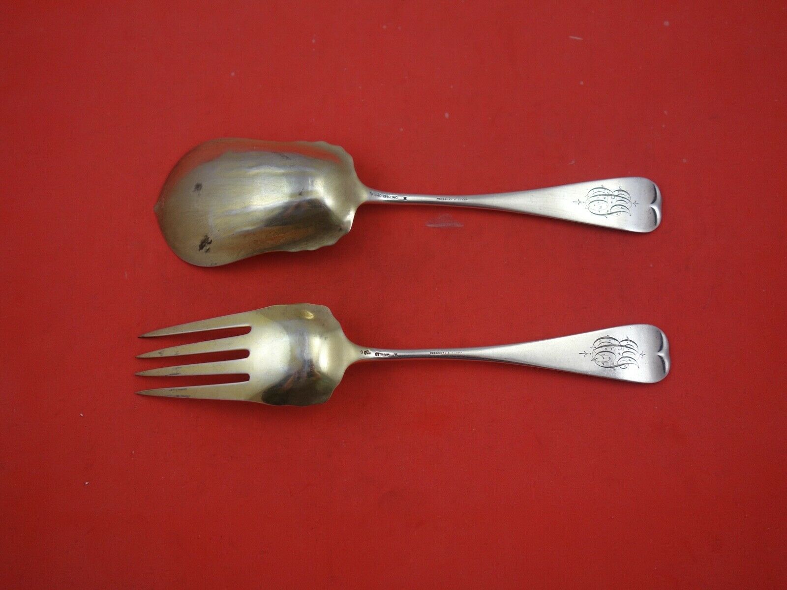 Sterling silver Salad Serving Set #9 Gold Wash All Sterling 9" in the pattern Fish in Net by Whiting. It is monogrammed on the reverse, see photo and is in excellent condition. Fabulous dimensional applied net.