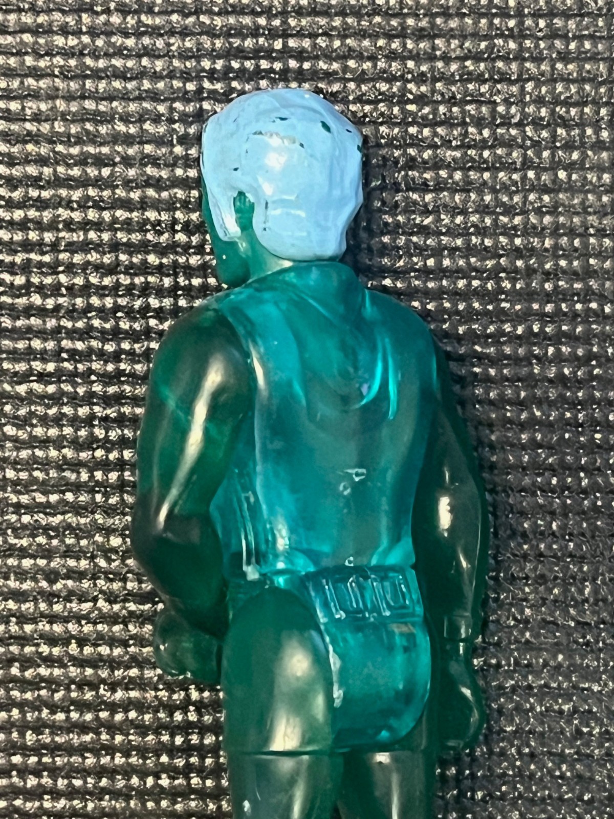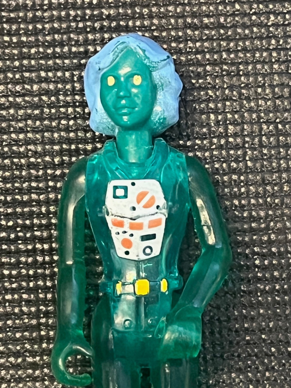 Features: Translucent green color with robotic/android styling; hard plastic transparent torsos, soft vinyl limbs; yellow dot eyes and robotic chest details; designed as non-violent sci-fi characters