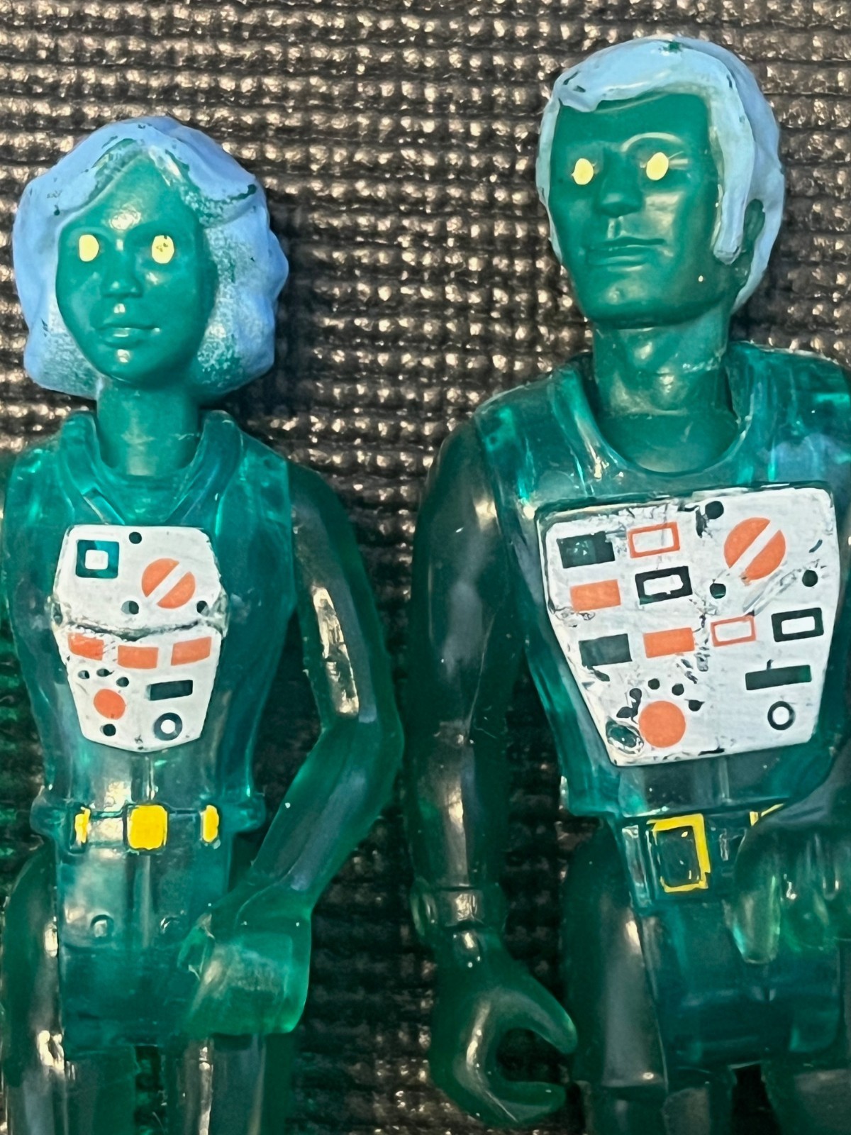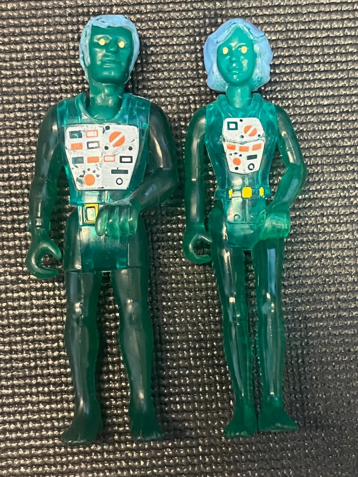Fisher Price Adventure People vintage sci-fi figures X-Ray Man and X-Ray Woman circa 1982 in a lot of 2. Translucent green android-style with articulated heads, arms, and legs. Popular collectible set.