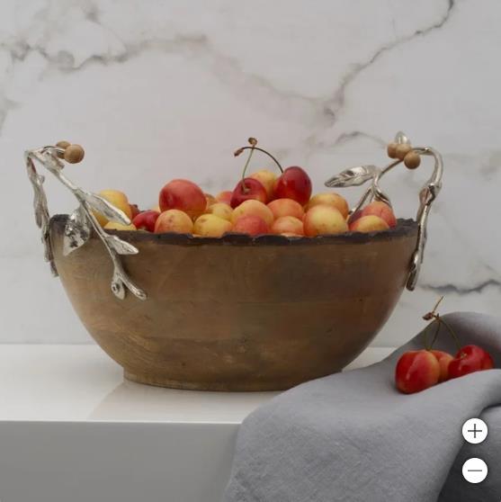 This Woodgrove Serving Bowl by Fitz and Floyd is perfect for serving pasta dishes, salad, fruit, bread, and so much more. The lustrous leaf details embellished with delicate, wooden beads add an elegant yet rustic look to your table. Use the built-in handles to easily carry the bowl from the kitchen to the table. Handcrafted from mango wood and antique brass with a nickel finish for long- lasting beauty. Measures 15 inches long by 10 inches wide by 6 inches high. Can hold up to 76 ounces.
