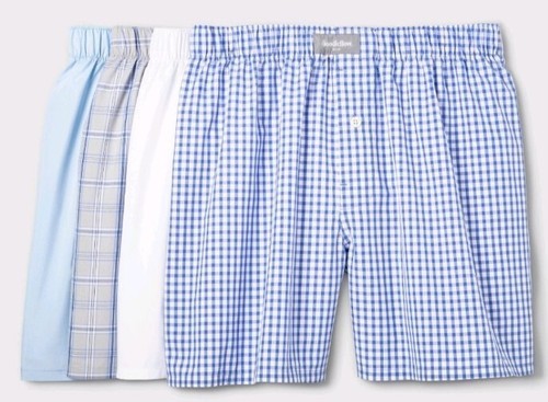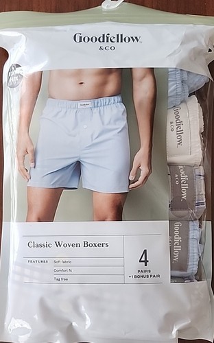 This Sale is For Goodfellow Co. Brand Boxers Five (5) Pair 2-Light Blue 1-Plaid 1-Check 1-White Mid-Rise Fit Functional Fly Full Elastic Waistband Soft Fabric Comfort Fit Tag Free Cotton ~ Polyester Boxers are new in the original packaging Please view photos for a good description of this item Thank you!