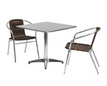 Additional Features Table and Chair Set Set Includes Table and 2 Chairs Lightweight Design Designed for Indoor and Outdoor Use Designed for Commercial and Residential Use Square Table Table Size: 31.5 W x 31.5 D x 27.25 H in. Smooth Stainless Steel Table Top Aluminum Column and Base Plastic Floor Glides Stackable Cafe Chair Stacks up to 20 Chairs High Curved Back Dark Brown Rattan Seat and Back Integrated Arms Cross Braces provide extra stability Aluminum Frame Plastic Floor Glides