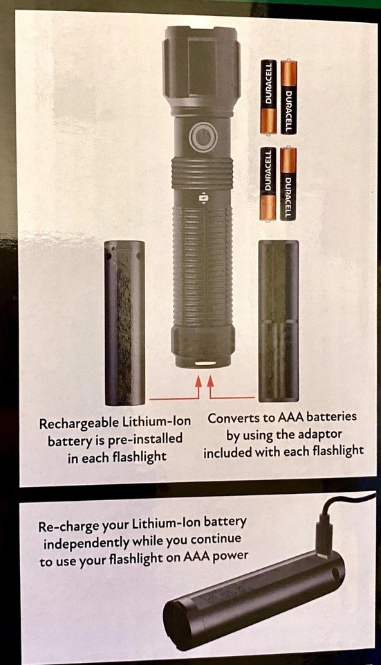 This flashlight features Dual Power technology, which allows you to use either a Lithium-Ion rechargeable battery or standard AAA batteries.