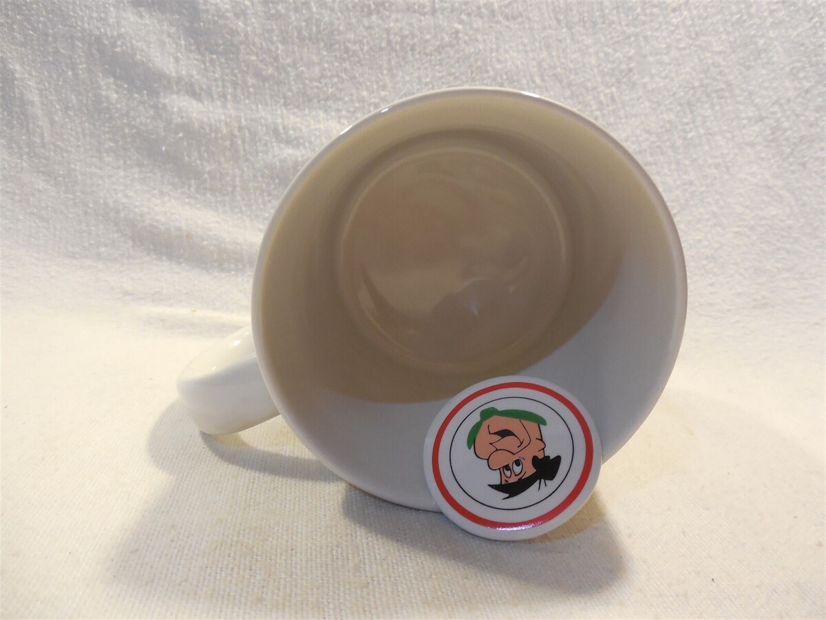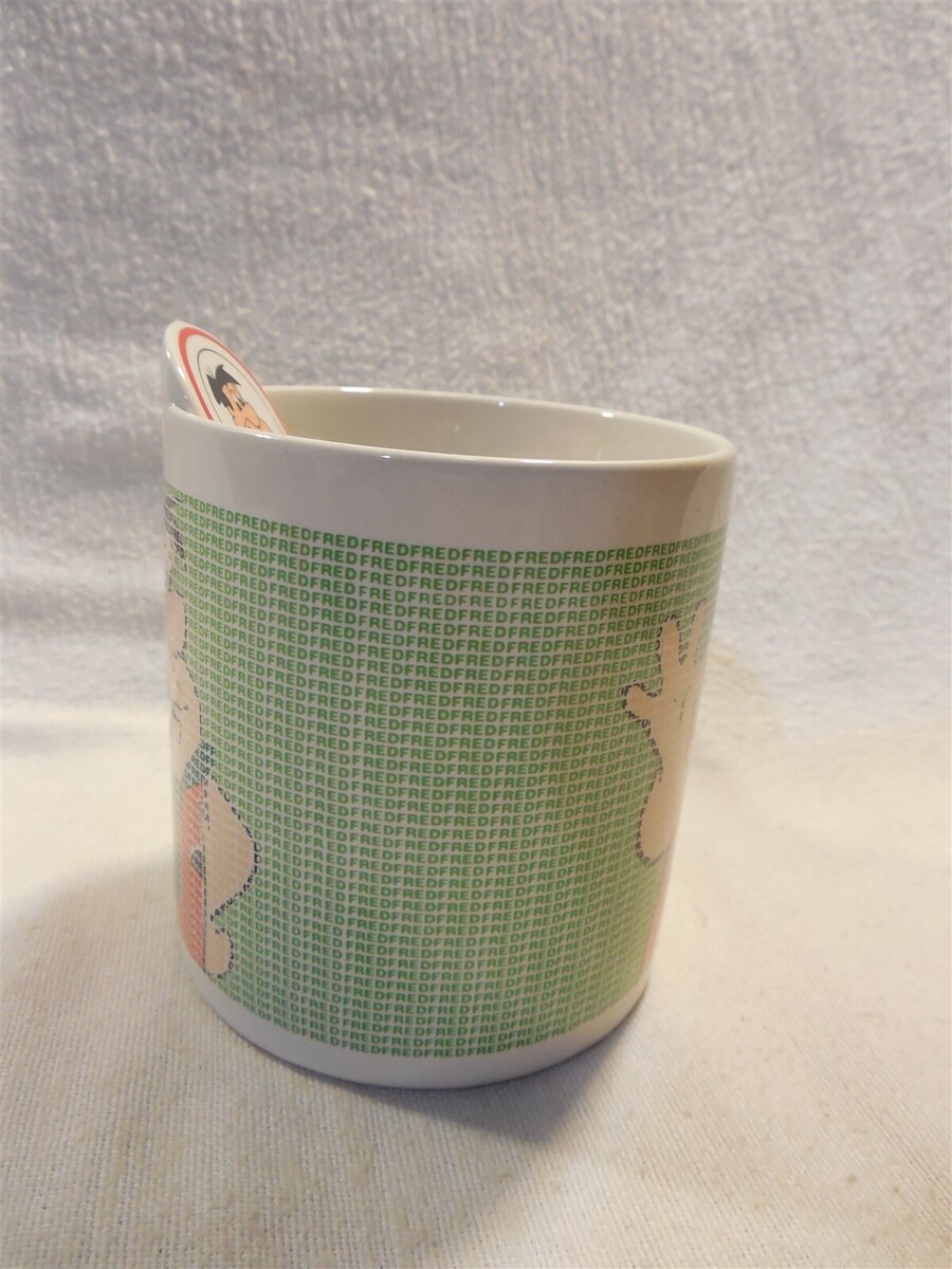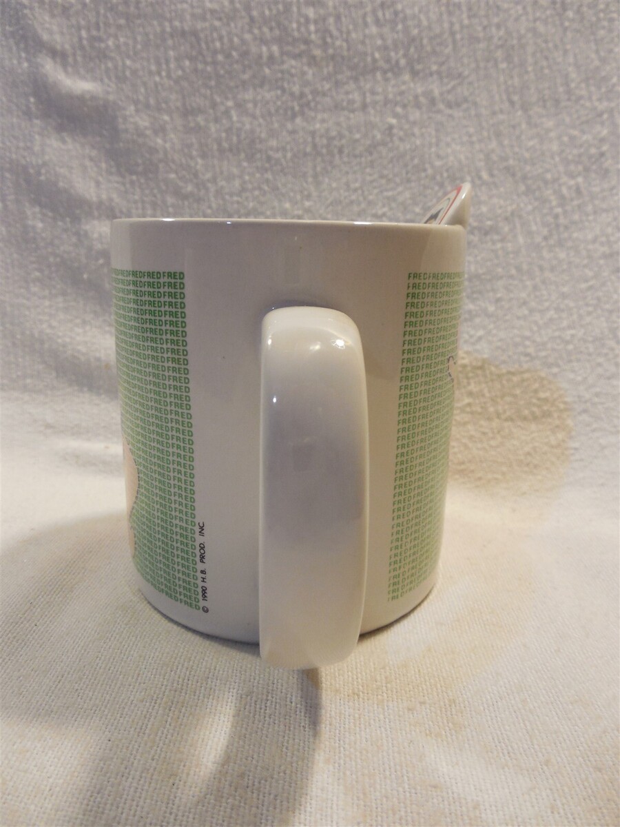 This is a Flintstones 1990 HBP ceramic word art coffee mug. The mug pictures Fred Flintstone on 2 sides. The word Fred is repeated in different colors to create the picture. There is a ceramic piece inside the one edge which has a picture of Fred. The coffee mug measures approximately 3 3/4" tall and 3 1/2" in diameter. Powered by SixBit's eCommerce Solution