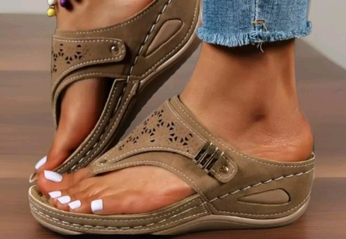 This Sale is for One (1) Pair of Wedge ~ Flip Flop Sandals BROWN in Color Women's Size 9M ~ Foot length approximately 10.1" ~ Shoe length approximately 10.2" Wedge measures approximately 2.25" tall The front platform measures approximately 1" Faux Leather Upper Cutout overlay across top with a gold side buckle Outsole is Polyurethane PU Sandals are new ~ never worn Please view photos for a good description of these sandals Thank you!