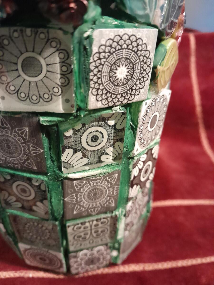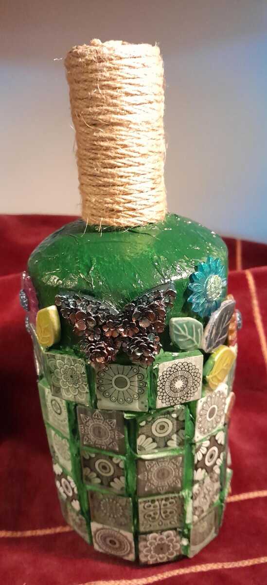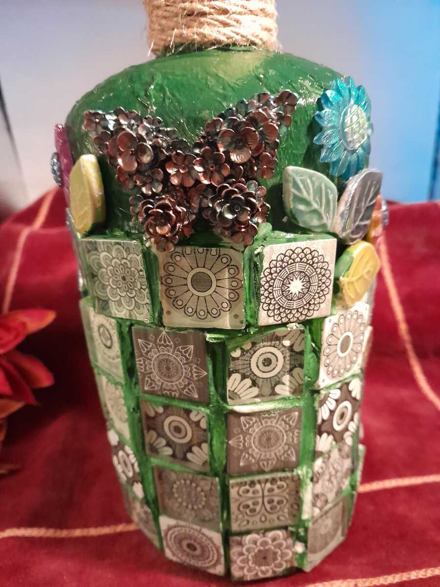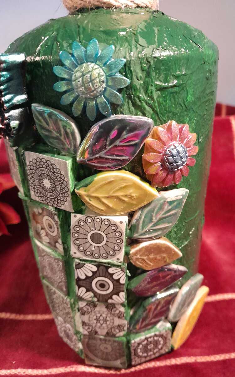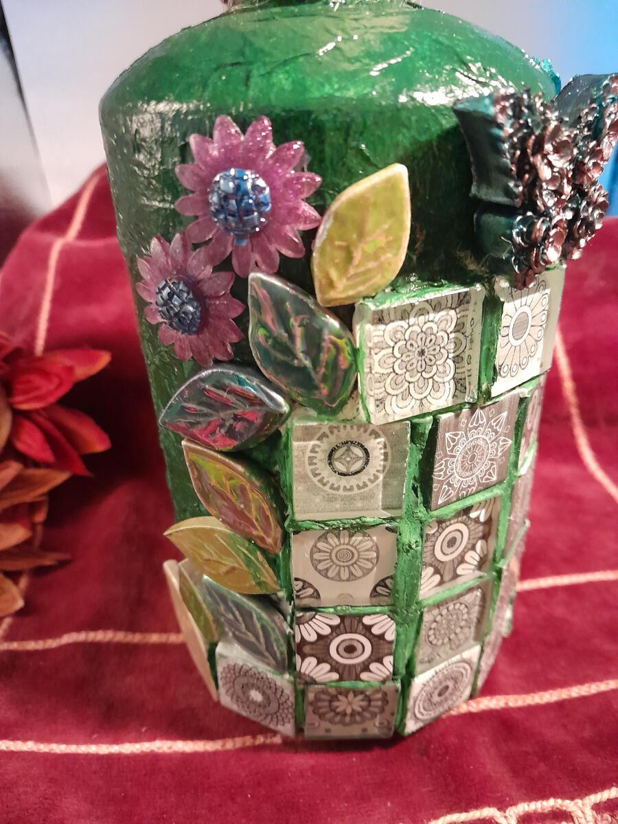 - Floral Mosaic Unique Mixed Media Glass Spirits Bottle Recycled Display Mantle De