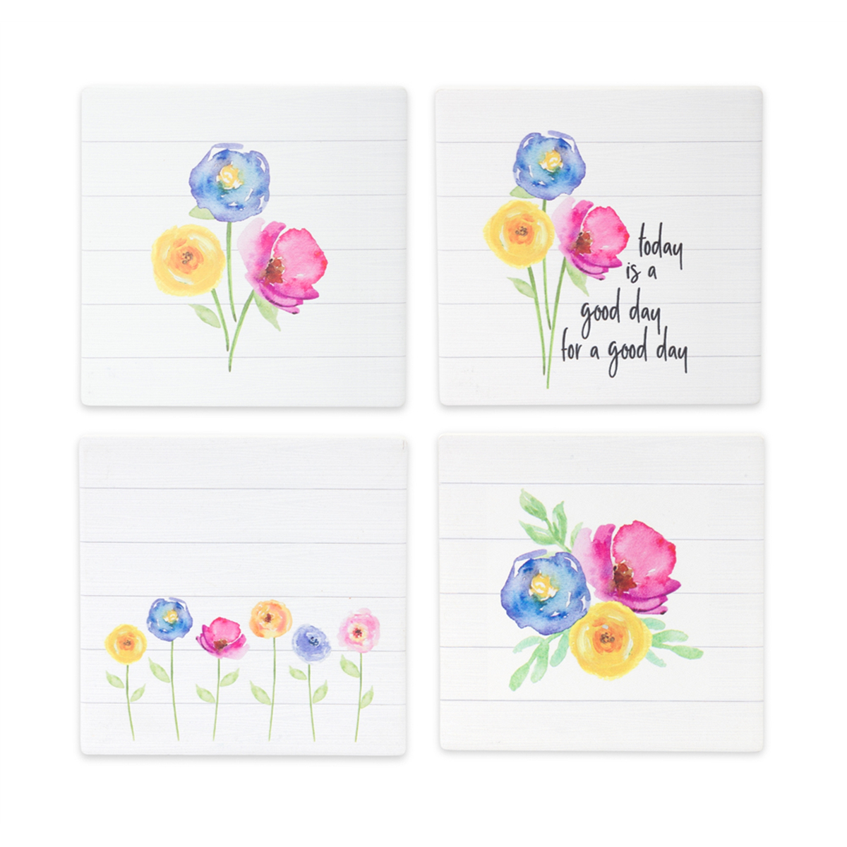 Brighten up your home with this beautiful set of Floral Tiles, crafted from durable stoneware and designed to inspire. These 4" coasters feature elegant floral patterns in white and black, perfect for adding a touch of charm to any space. Whether you re celebrating Easter with family or simply looking to refresh your spring decor, these coasters bring style and sentiment to your table. The thoughtful sentiment "It s a good day to have a good day" will add positivity to every gathering. With a cork backing to protect your surfaces, these coasters are both functional and beautiful, ensuring lasting quality for seasons to come. Sold in a set of twelve pieces with four assorted designs to make a statement in your home or event space.