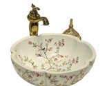 Product description: Transform your bathroom into a gallery of elegance with this exquisite flower-shaped ceramic art basin. The stunning white porcelain vessel features delicate hand-painted floral and bird patterns that bring a touch of vintage Asian artistry to modern luxury spaces. Measuring 16.2" in diameter with a 5.9" height, this generously sized washbasin provides both functionality and artistic beauty for your daily routines. The high-fired ceramic construction boasts a glossy finish that's easy to clean and resistant to scratches, ensuring lasting beauty. Designed for above-counter, vessel-style installation, this Interoknack basin fits standard 1.77" drain openings and makes a perfect centerpiece for powder rooms, master bathrooms, or boutique hotel settings. Each basin showcases exemplary craftsmanship with its unique flower shape and intricate hand-painted details that will elevate any vanity with timeless charm.