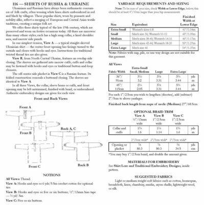 Folkwear Patterns with Timeless Style Folkwear 116 Shirts of Russia Ukraine Blouse Dress Robe European Traditional Sewing Pattern (Pattern Only) folkwear116 Sizes: Misses 6-20; Men's 32-48. These popular shirts reflect a merging of European and Central Asian traditions, and can easily be lengthened for versatile dress or robe styles. Three neck opening variations, including center front and side front. Make the basic design quickly and then embellish it with authentic embroidery motifs. Historical lore and embroidery instructions included. Suggested fabrics: Light or medium-weight soft fabrics such as cotton, broadcloth, linen, chambray, muslin, rayon challis, lightweight wool, or silk. Combine other Supplies or Fabrics from our store for shipping discount. Michigan Residents add 6% Sales Tax.