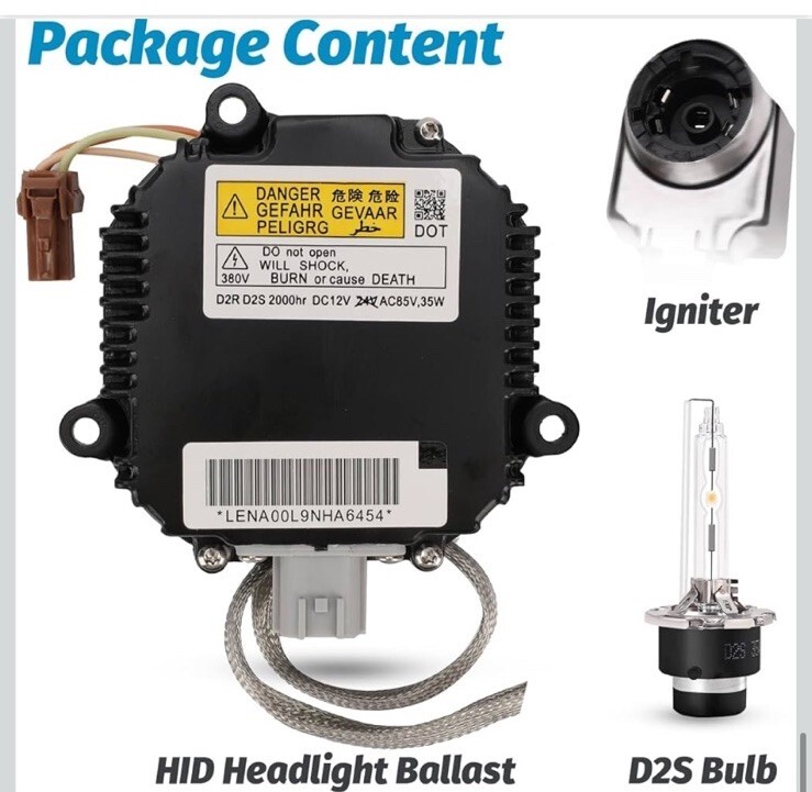 The product is a 2012-2014 2015 Infiniti QX60 HID Xenon Headlight Ballast Igniter by Yiksal. It is an OE Spec part with certifications from OE, SAE, and DOT. The ballast igniter has a wattage of 35W and operates on DC current. It includes a 5-year manufacturer warranty, features an electric ballast design, and is designed for direct replacement with compatibility for Nissan models. The black-colored ballast igniter also comes with HID bulbs and mounting hardware, making it a vintage part with a unique part number.