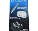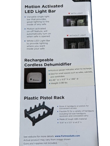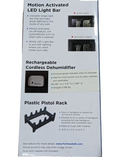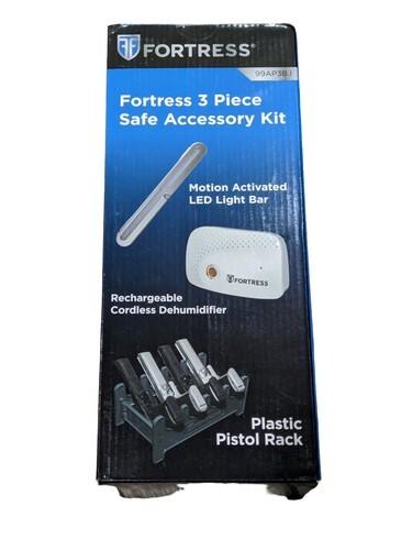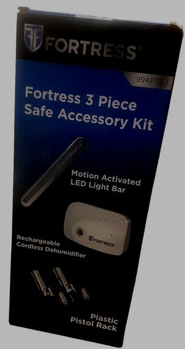 Fortress three-piece safe accessory kit. Comes with motion activated LED light bar. Rechargeable cordless dehumidifier. Plastic pistol rack. Versatile single light bar provides great lighting to the inside of any safe. Motion activated on and off will automatically turn on when safe is opened. White LED light bar to provide lighting where you want inside you're safe.