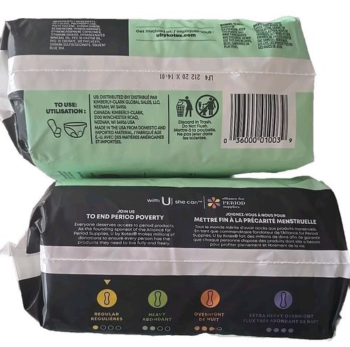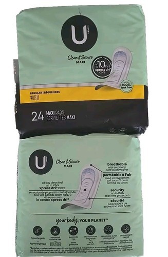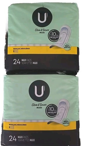 This Sale is for Two (2) Packages of U by Kotex Clean Secure Maxi Pads 24 Count (48 feminine pads total) in each bag Clean Secure SIZE REGULAR These period pads feature unique absorbent technology that offers up to 9 hours of protection Hypoallergenic and dermatologist-tested U by Kotex Clean Secure menstrual pads also are made without fragrances ~ lotions ~ elemental chlorine ~ pesticides and natural rubber latex Cottony ~ soft-touch cover Individually wrapped All-night protection Made in USA New in original packaging Please view photos for a good description of this item Thank you! Ingredients ~ Wood Pulp ~ Water/Eau ~ Hydrocarbon Resin/Resine Hydrocarbonee ~ Polyethylene ~ Pigment White 6 ~ Styrene/Isoprene Copolymer ~ Hydrogenated Mineral Oil ~ PEG-10 Castor Oil ~ PEG-15 Cocoate, Diethylhexyl Sodium Sulfosuccinate ~ Solvent Blue 104
