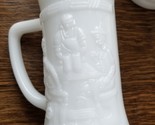 This sale is for four (4) Federal Milk Glass Mugs Steins ~ Tankards Embossed with a pub scene White Milk Glass Holds approximately 10 ounces of liquid Each mug measures approximately 6" tall x 3.5" @ base (3" at top) Mugs are in good ~ vintage ~ pre-owned condition (one mug has a repair - see picture #4) Please view photos for a good description of these items Thank you!