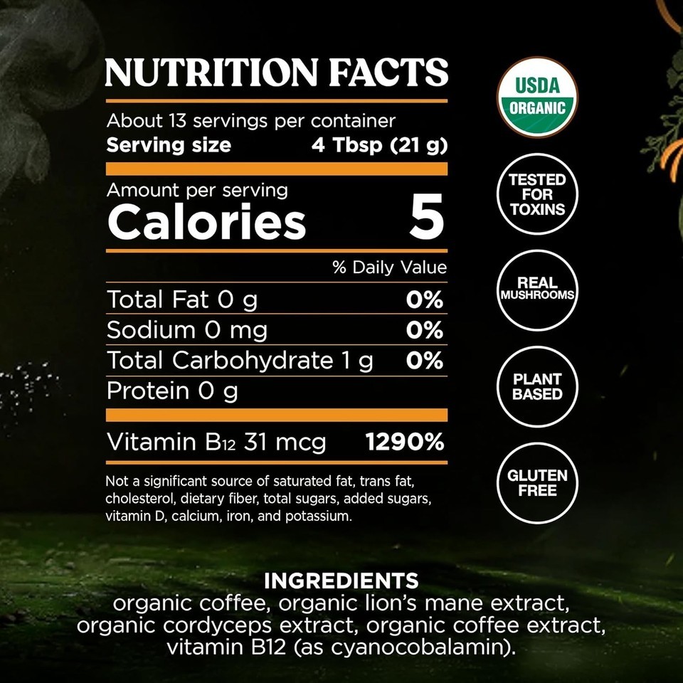 YOUR DAILY ROCKET FUEL ? Each brew creates a delicious cup of flavorful, dark roast coffee with notes of chocolate and nuts. A blend that provides the spark you need to power even your most demanding days. We?ve paired this premium coffee with three amplifying ingredients: organic coffee extract, L-theanine and organic cordyceps mushroom extract. When busy doesn?t even begin to describe your day, this energy boosting blend, with about 190mg of caffeine per 12oz cup, helps you get it all done.