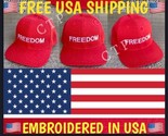 EMBROIDERED IN USA SHIPS FREE FROM USA. This Patriotic Memorial Baseball Cap is a Red cap featuring an embroidered design of FREEDOM. It is adult adjustable in size with a rear vellcro closure. This professionally embroidered cap is perfect for those who are patriotic and support the ideas of making America great. All are adult sized, brand new, unisex, professionally embroidered and offer premium quality. This baseball cap is a stylish and meaningful accessory for those who want to show their support for their country and specific individuals or causes.