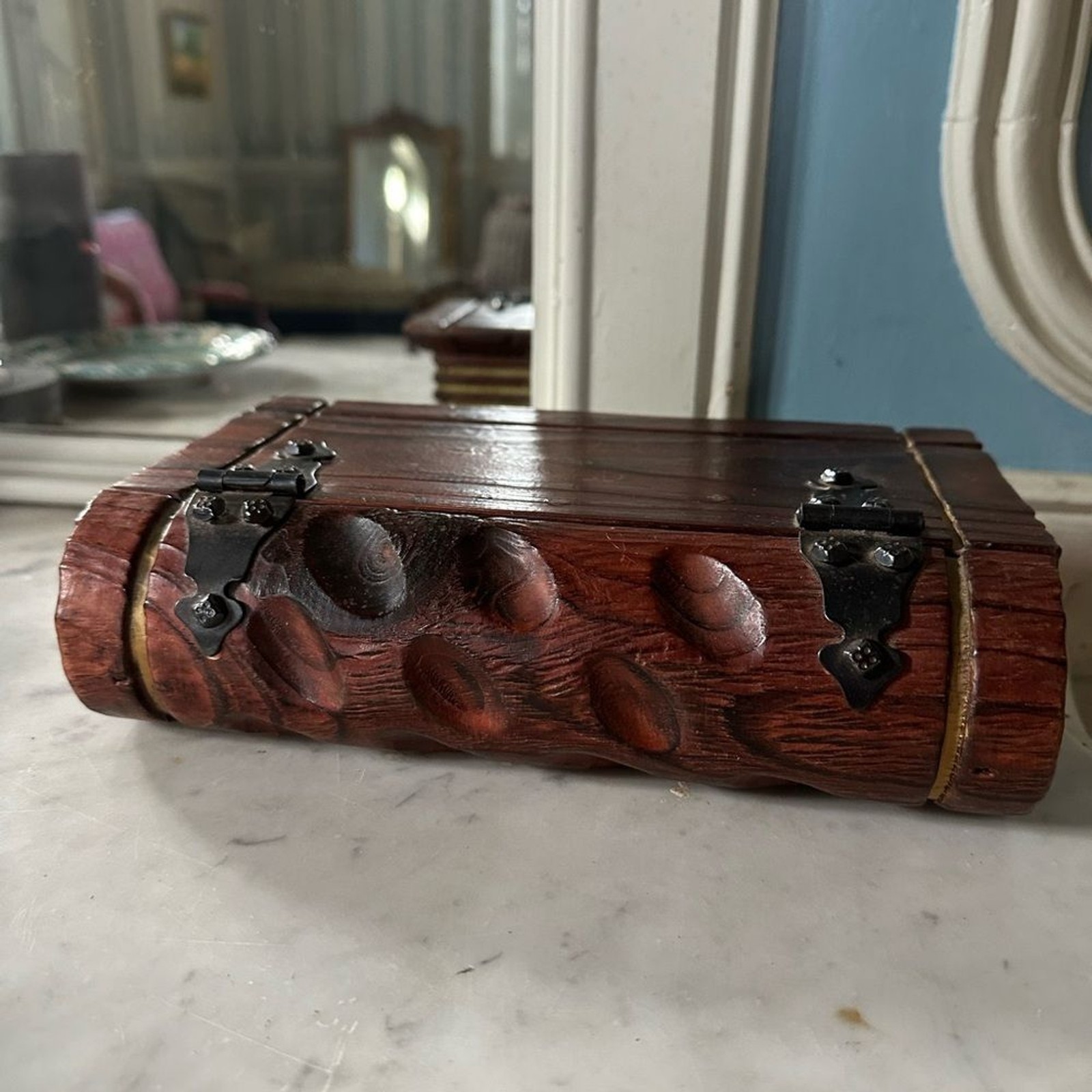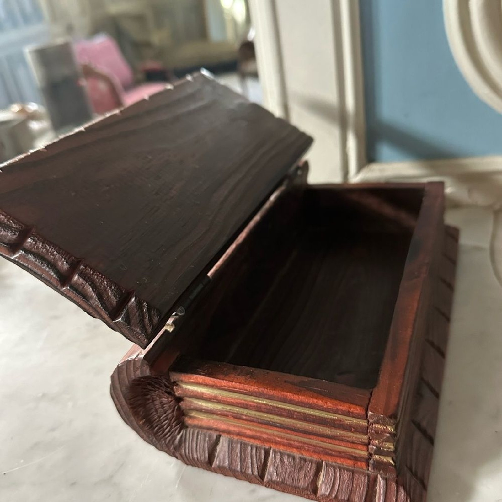 - French vintage hand carved wooded book box with lid: secret book with hinges