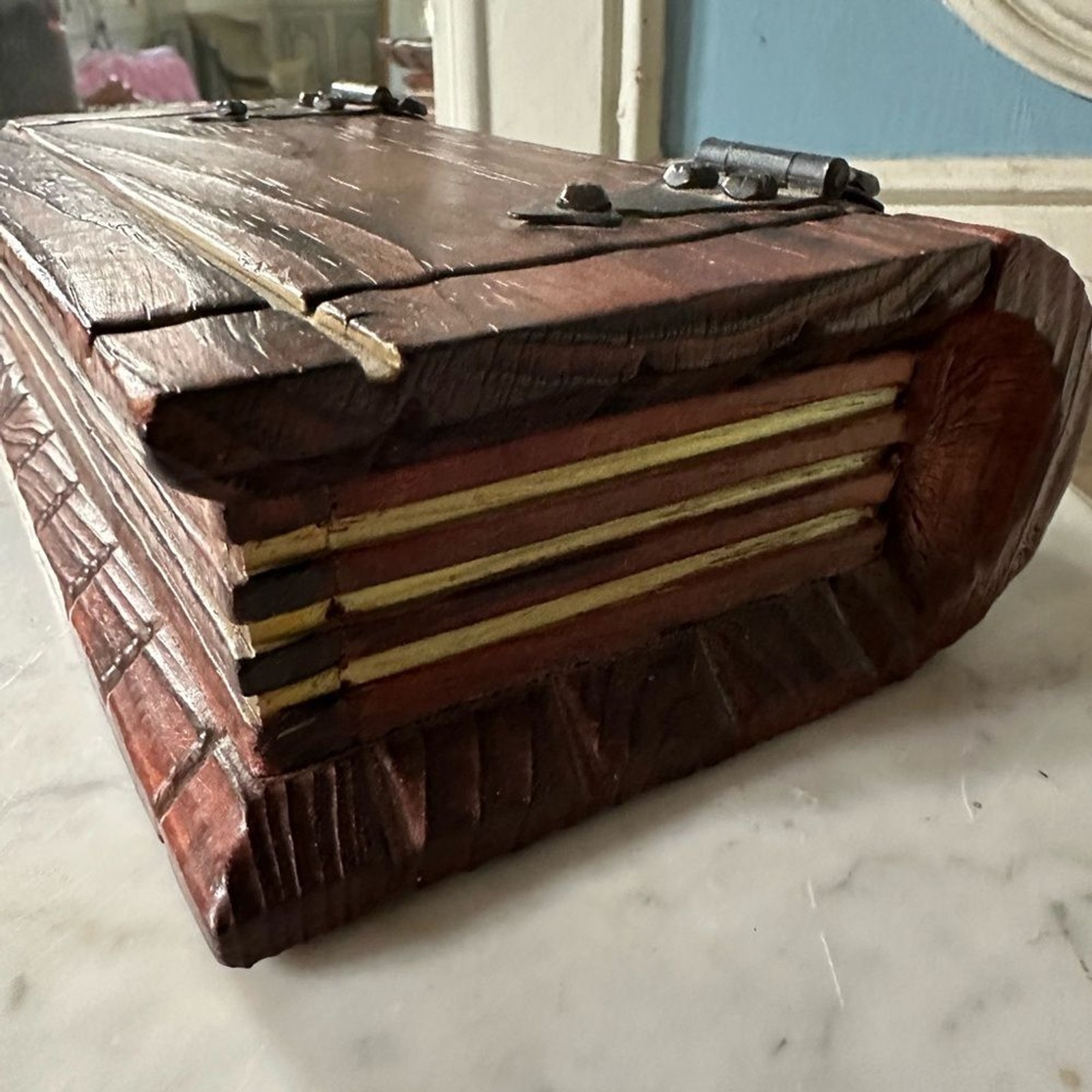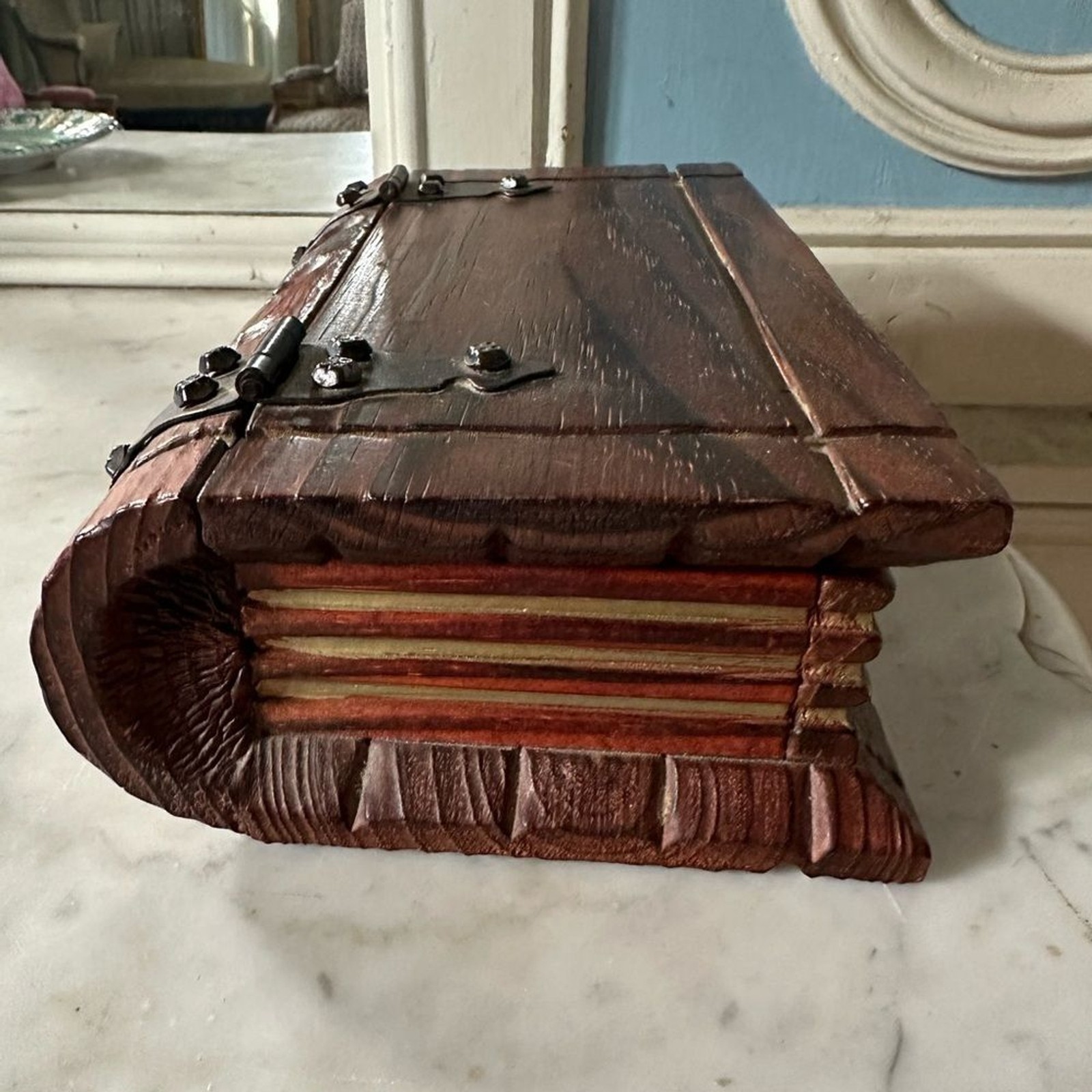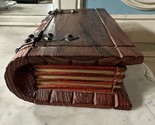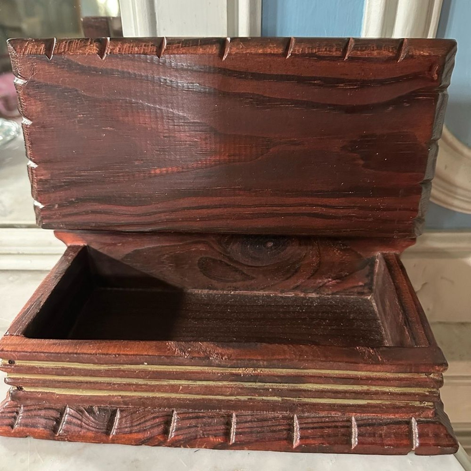 A vintage wooden box crafted in the shape of a book, perfect for adding a touch of antique charm to your home decor.