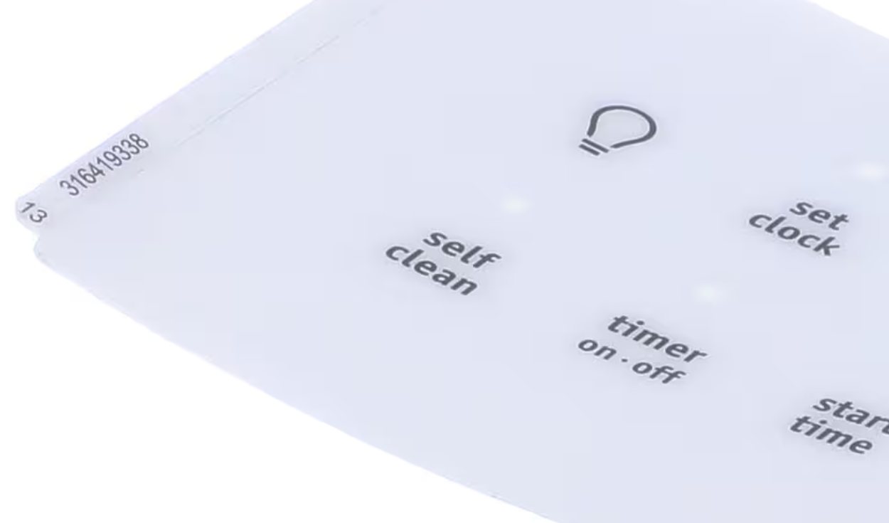 The Frigidaire 316419338 Control/Timer Overlay, ES330, White, Range is a genuine OEM replacement part designed to cover and label the electronic control panel of your range. This overlay provides a clean, white finish and clearly marked functions, making it easy to operate your oven and timer settings. If your current overlay is worn, cracked, or faded, replacing it restores both the look and usability of your appliance.