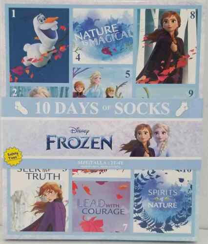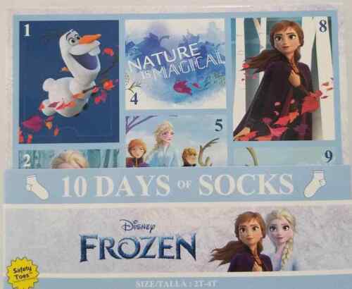 Frozen Toddler Girls 10 Days of Socks Frozen Toddler Girls 10 Days of Socks The Disney Frozen 10 Days of Socks Advent Calendar is perfect for giving. This gift pack of socks makes a great early present to count down the days until Christmas. It comes with 10 pairs of socks, with each pair housed in a separate closed section of the gift box so the recipient can be surprised with a different pair each day leading up to Christmas. The sock set includes 10 pairs of quarter socks, with an array of Disney Frozen -themed graphics ? so your gift recipient has tons of fun options they'll love wearing even after the holidays Listing and template services provided by inkFrog