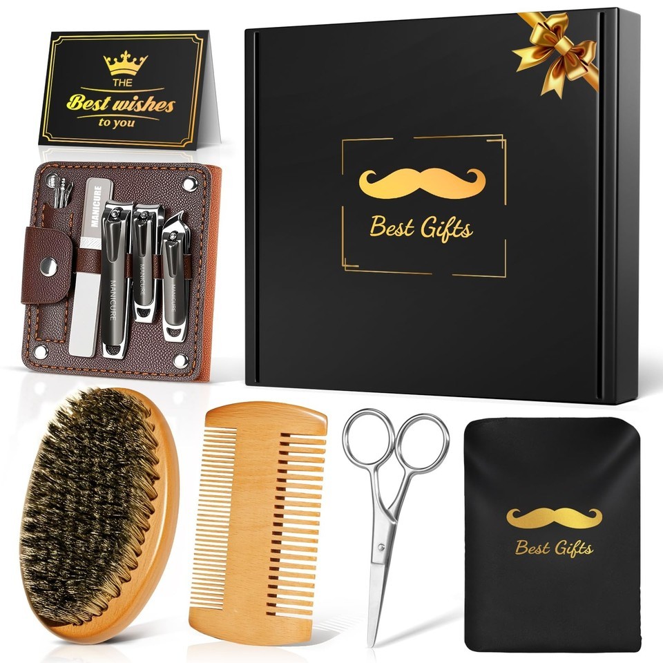The Perfect Gifts for Him: This high-quality beard care set includes a premium beard brush, beard comb, scissors and nail clipper set, meticulously crafted from durable materials, offering a perfect daily beauty experience. This is perfect birthday, Christmas, white elephant gifts, stocking stuffers, anniversary Valentine's Day gift for husband, boyfriend, dad or grandpa. Anniversary Gifts for Men: This beard brush and beard comb set is the perfect gift for men, making their beards and small beards look smooth and shiny. Small but effective, this is men self care gifts that shows you care about his daily image. Fashionable and practical, this beard care bag is the perfect choice for modern gentlemen. Portable Travel Kit: The compact and travel-friendly design comes with a stylish storage pouch that fits easily in luggage or carry-on bags. Keep your beard neat and well-groomed during business trips, vacations or daily commutes. Keep your beard smooth and neat: This is perfect beard grooming kit. Our beard brush and comb set massages facial hair to keep facial hair and skin healthy. The portable scissors also allow you to trim your beard at any time. Nail clipper set: The set contains three pieces of nail clippers and a three-piece tool for cleaning ears, lightweight and easy to store, its appearance design is fashionable and elegant, whether you are at home or traveling, you can easily carry it.