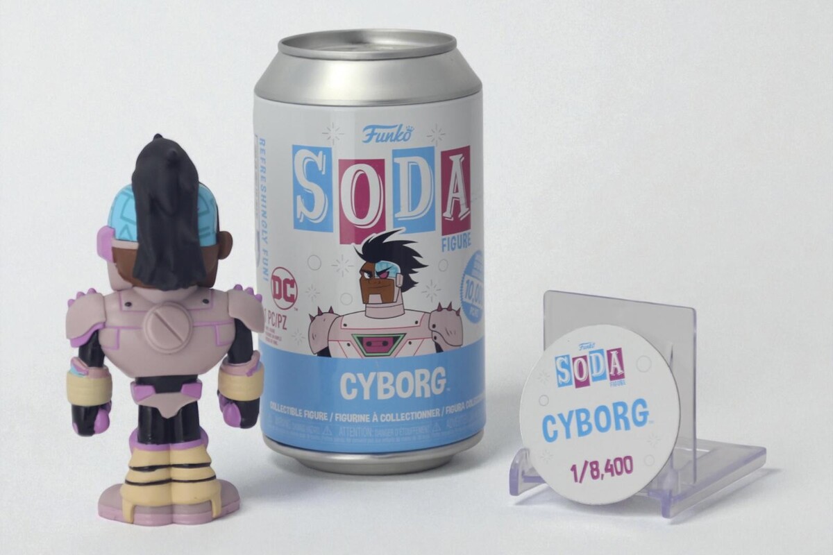 Official Funko Soda collectible vinyl figure featuring Cyborg from DC Comics. Highly detailed design capturing Cyborg's iconic look. Includes collectible coin with a rarity of 1/8,400. Figure stands approximately 3.75 inches tall. Packaged in a soda can-style box, perfect for display or gifting. Condition: Very Good, ensuring a quality collectible for fans and collectors alike.