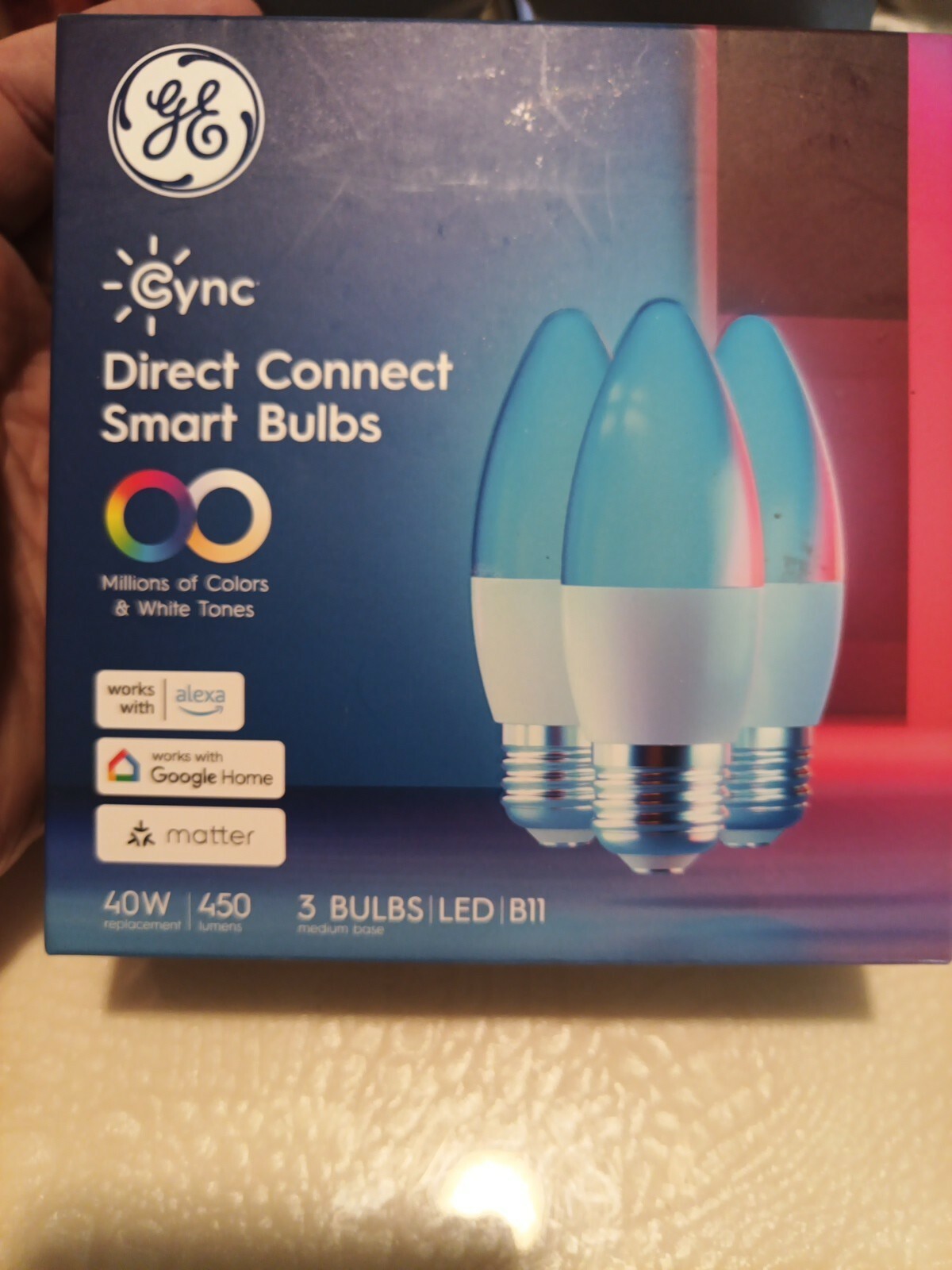 The GE Cync Smart LED Light Bulbs are color-changing decorative light bulbs designed for indoor use. These E26 medium base bulbs provide multicolor and white light options, with a white brightness of 450 lumens. With a wattage of 5.5, these LED light bulbs offer a long operating life of 15,000 hours. They can be controlled using Bluetooth, Matter, or Wi-Fi, and are suitable for various uses such as lamp lighting, party decor, ceiling fan illumination, mood lighting, and back lighting. These bulbs are designed for easy installation and come in a pack of three.