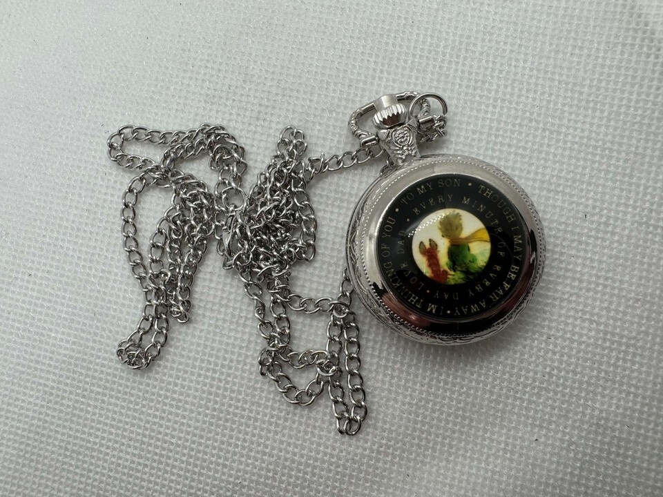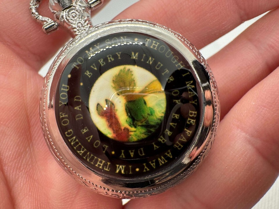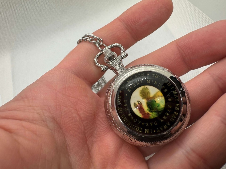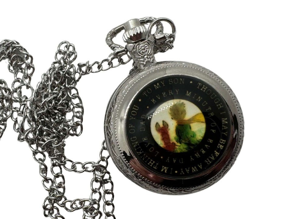 The front of the watch features a beautifully depicted scene of The Little Prince with his beloved rose and fox, serving as a poignant reminder of the key themes of the story. Accompanying this mesmerizing illustration is a heartfelt inscription: ?To My Son, Though I May Be Far Away, I Am Always Thinking of You.? This personal touch makes the watch a perfect gift for meaningful occasions such as birthdays or graduations.