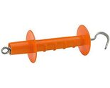 Orange, heavy duty, Gate handle, insulated handle, large protective shields, galvanized, non-turning hook, hook is flat for maximum electrical contact, heavy duty tension spring.