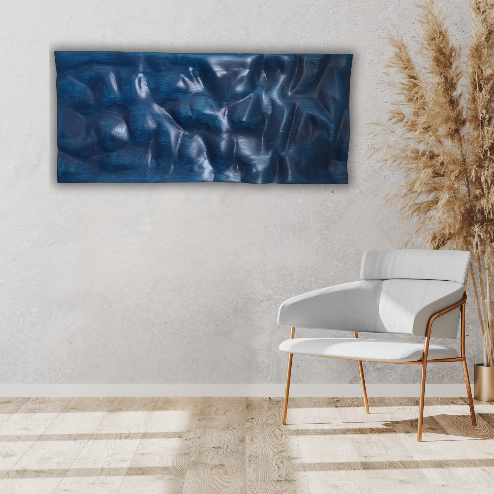 The surface is meticulously carved to create organic, flowing forms, finished in a deep sapphire blue patina that shifts with the light. Subtle highlights and shadows reveal new details with every glance, offering a dynamic experience reminiscent of waves, fabric, or abstract landscapes.