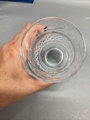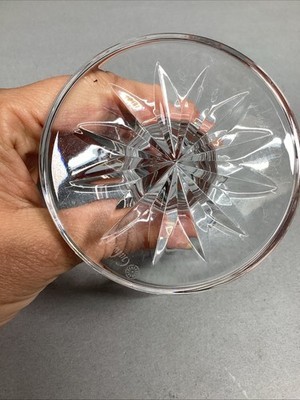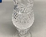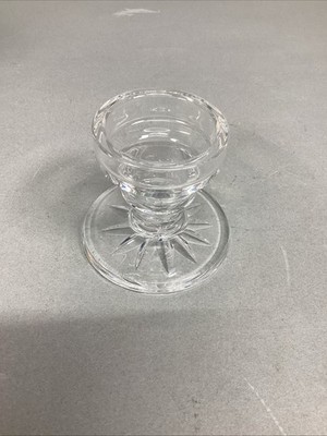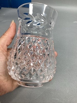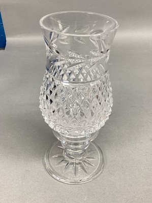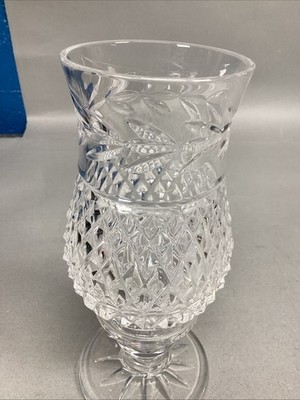 Galway Crystal ?Leah? Hurricane Lamp (2 Piece). In good, used condition. The globe measures 5?Hx2 7/8?D (measured at the top opening). The bottom portion measures 3?Hx2.25?D. Together, they are 7.5?H.