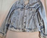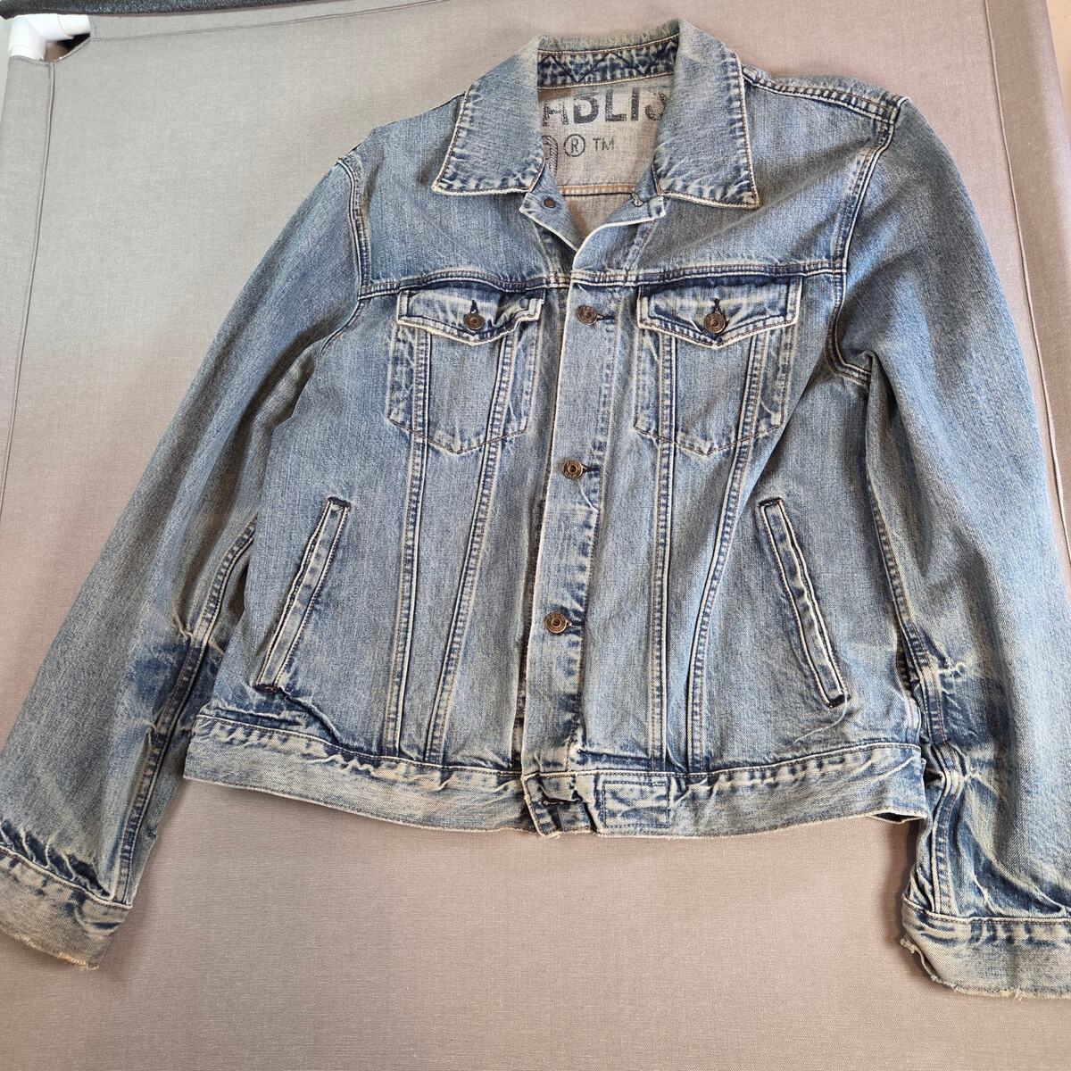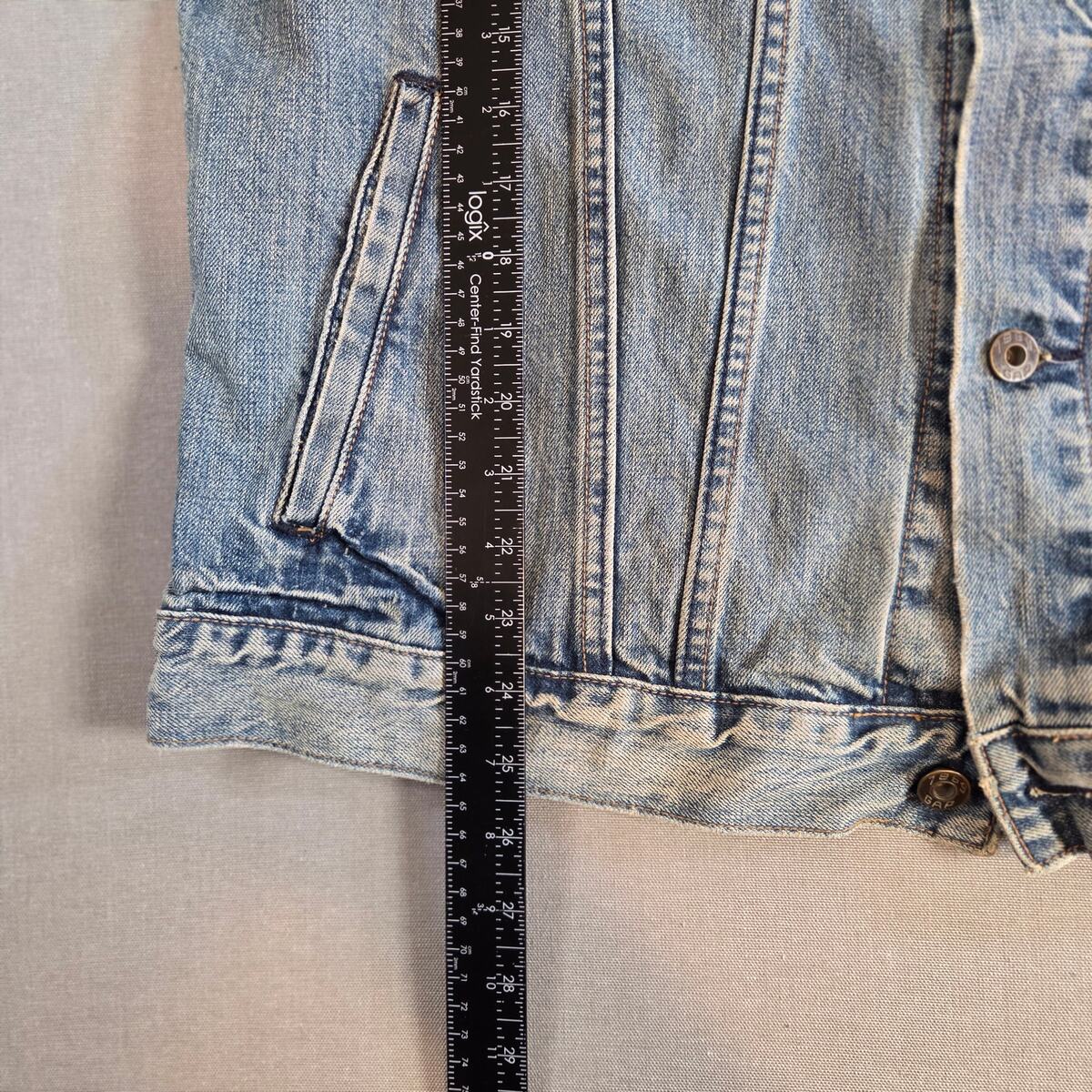 This Gap 1969 denim trucker jacket comes from the Fall 2006 release, crafted from 100% cotton in a medium tint wash. The piece features classic styling with button closure, chest flap pockets, and side welt pockets. The original size tag is missing, but measurements suggest a men?s medium to large fit ? please see measurements for accuracy. Jacket shows signs of wear with light marks and fraying at the cuffs, giving it a naturally distressed look. Brand: Gap Jeans 1969 line Style: Trucker denim jacket Year/Season: Fall 2006 production Material: 100% cotton Color: Medium tint wash Size: Tag missing (fits like Men?s M/L ? see measurements) Features: Button front, chest flap pockets, side welt pockets Condition: Pre-owned, fraying at cuffs, some marks Made in Macau