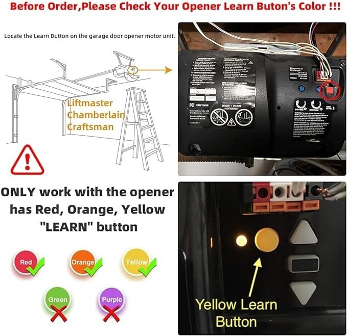 NOTE: Works with Chamberlain, LiftMaster, Craftsman Merik Garage Opener with YELLOW,RED,ORANGE Smart Learn Button.Before purchase,please ensure has this learn button,or it will NOT works.