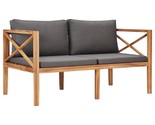 Durable Material: Made from fine-sanded teak, this bench ensures a long-lasting outdoor experience. Cushion Comfort: Comes with soft polyester cushions that offer extra comfort while lounging. Weather-Resistant: Built to withstand outdoor elements while keeping its good looks over time. Easy Assembly: Simple setup needs just a screwdriver and two people for smooth assembling. Visual Appeal: Stylish grey cushions with a natural wood finish look fab in outdoor settings. Color: Grey Shape: Rectangular Material: Solid Teak Wood Finish: Weathered Indoor/Outdoor: Indoor / Outdoor Cover Included: No Room: Garden and terrace Capacity: 2 Maximum Number of People: 2 Maximum Weit: 440.9 lbs Dimensions: 48.0 x 48.0 x 23.6 in (W x L x H) Surface Height: 2.0 in Leg Height: 12.0 in Weight: 35.63 lbs Seat Depth: 24.8 in Seating Capacity: 2 Swings: No Delivery Contains: 1 x Bench Assembly Required: Yes Recommended Number of People for Assembly: 2