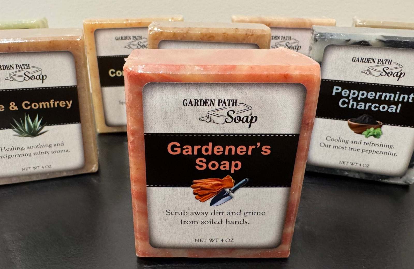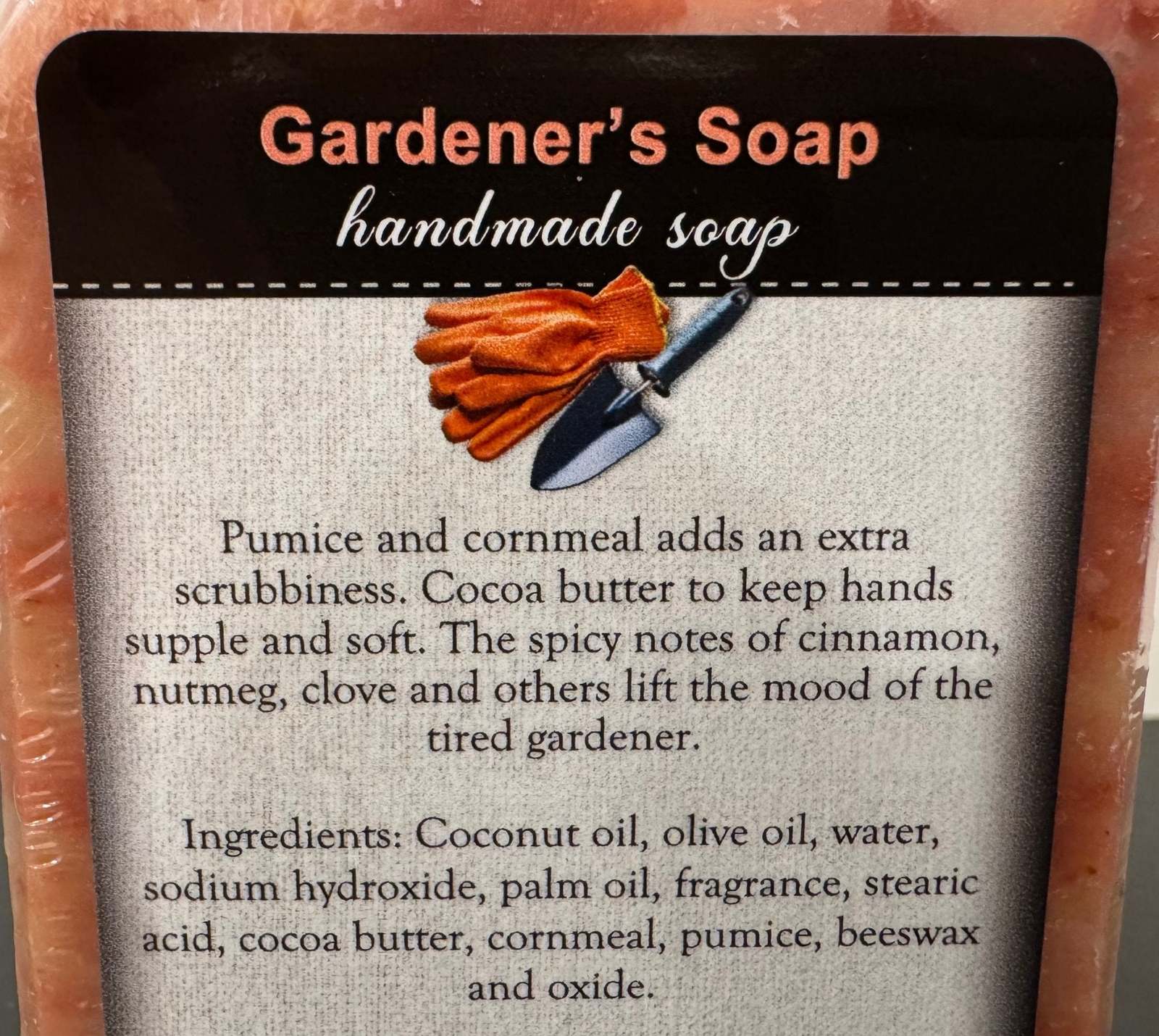 Amish Handcrafted GARDENER'S SCRUB Bar Soap Scrub away the dirt of a good day's work with this exfoliating Amish handcrafted Gardener's Soap. Tough on soiled hands. Cornmeal and pumice added for extra scrubbing strength. Super-fatted with cocoa butter to keep hands supple and soft. Restores moisture to dry hands. The cinnamon, nutmeg clove spicy scent lifts up the mood of the tired gardener. Formulated with natural grit like cornmeal and pumice, this cold-processed bar is tough on grime but gentle on skin. The fresh, herbal scent and creamy lather make it a favorite for hardworking hands and anyone who appreciates a deep, satisfying clean. Our herbal lye soaps are no ordinary soaps. They are an Amish handcrafted soap, bringing you all the special qualities that only a handmade soap can. They are made of pure saponified oils. Olive oil for a soft, enriching quality. Palm oil for a rich, smooth lather. Coconut oil for cleansing strength. We then combine these oils with special ingredients like cream butters, herbs, and other high-quality oils for their healing values. Our process is unique and done in small batches. Each bar is then hand cut. Fresh cut bars are cured and air-dried for 3-6 weeks allowing them to harden naturally before use. We hope you enjoy using our soaps as much as we enjoy making them. Why you'll love it: ? Amish handcrafted in small batches ? Contains natural exfoliants like cornmeal and pumice ? Gritty texture helps scrub away dirt, sap, and residue ? Cold-processed for a long-lasting, firm bar ? Approx. 4 oz - ideal for hands, elbows, and feet A must-have for gardeners, crafters, and anyone who works with their hands. Amish Handmade in Lancaster Pennsylvania USA