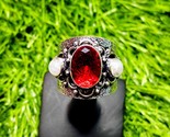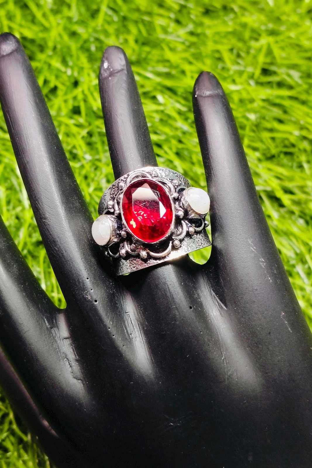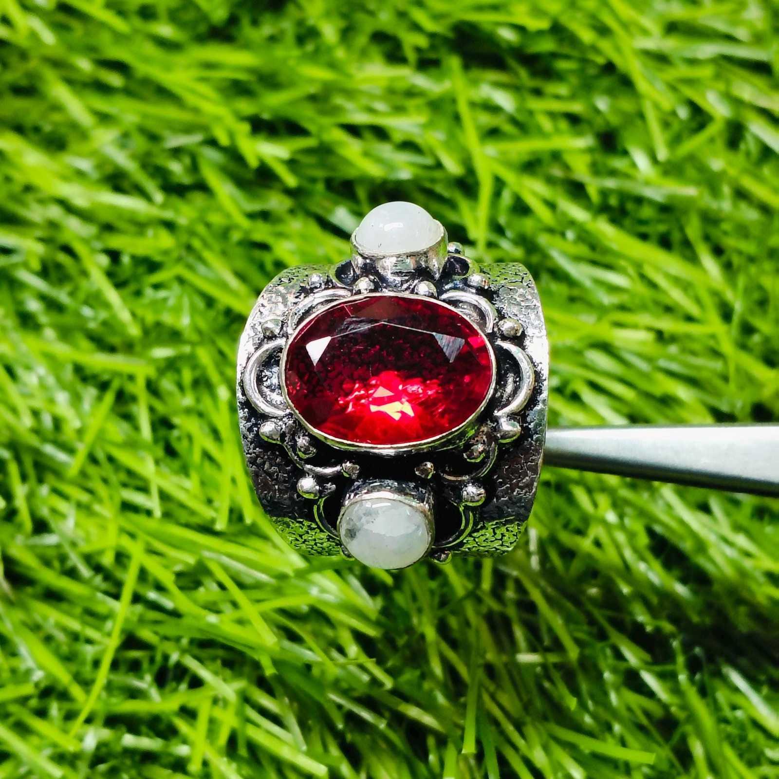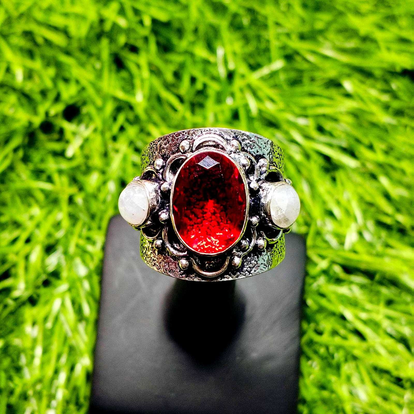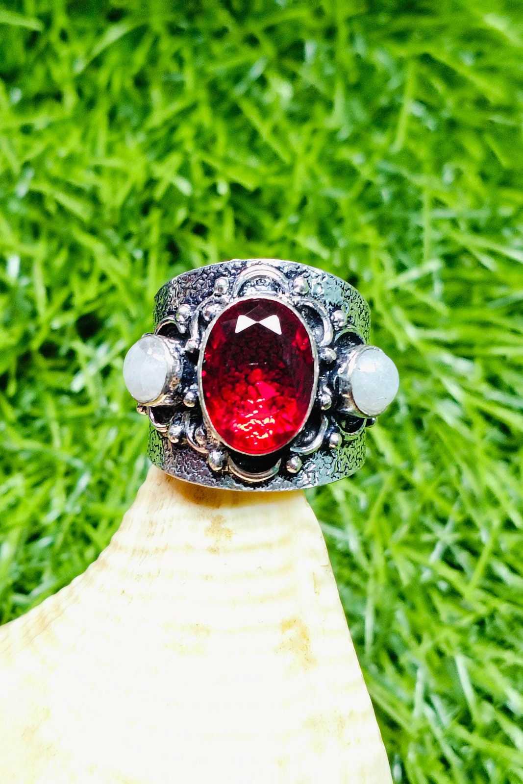- Garnet & Moonstone Ring – Boho Statement Tribal Silver Ring, Wide Band Adjustabl