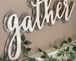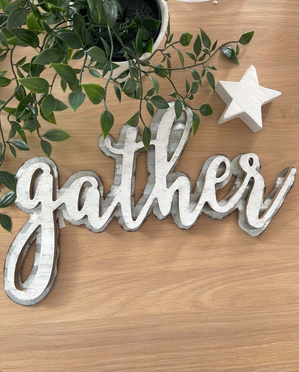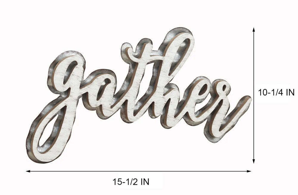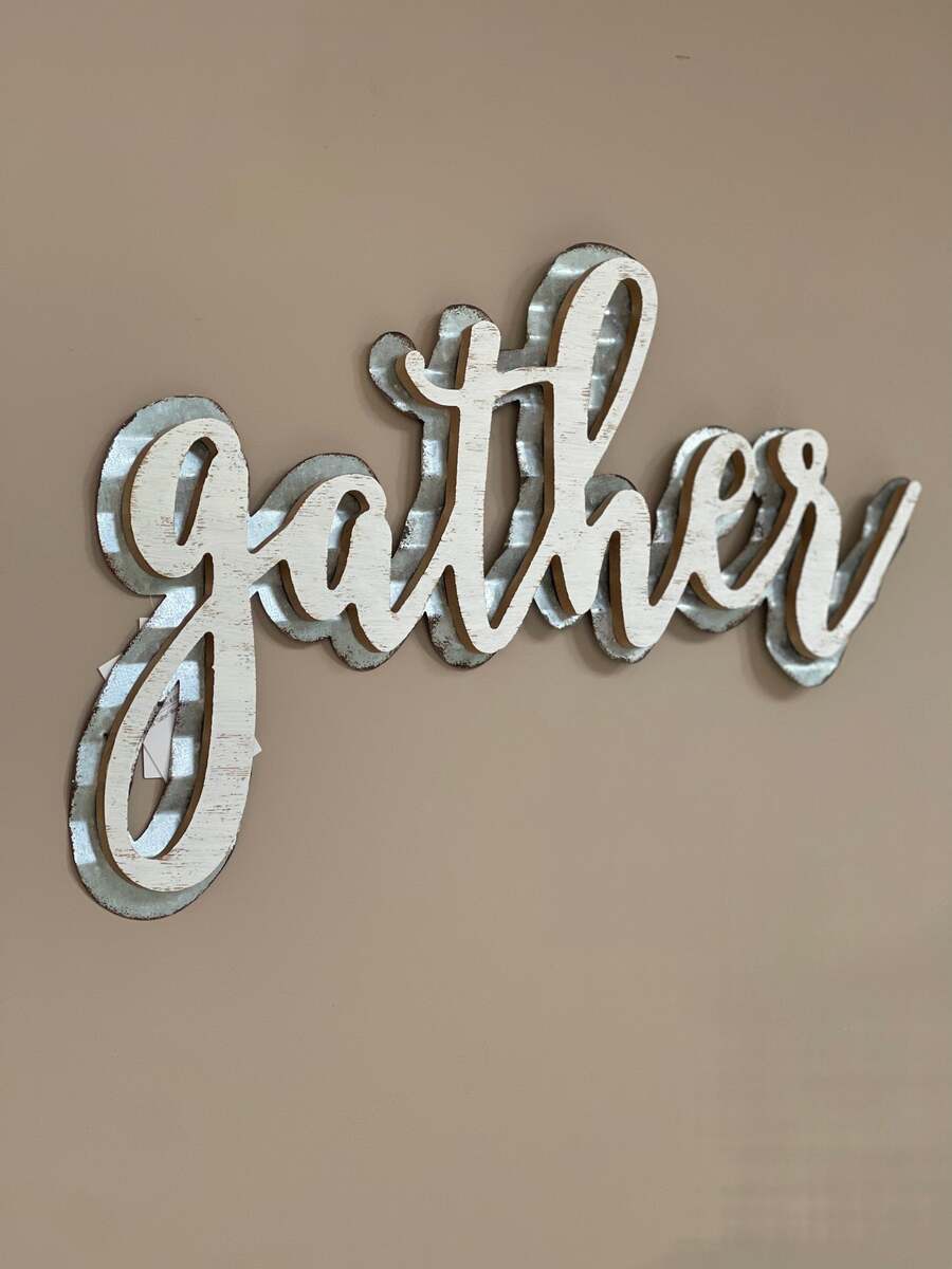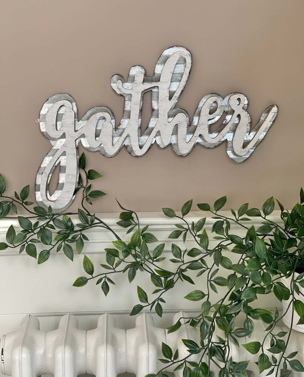 This handcrafted gather sign with whitewashed finish and waved galvanized metal design will add farmhouse and unique charm to any room.