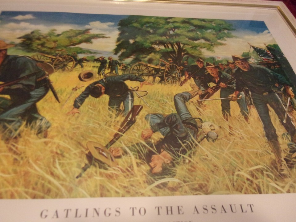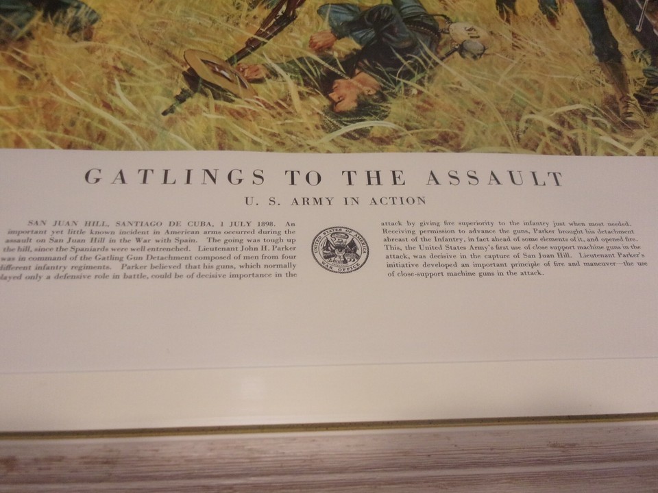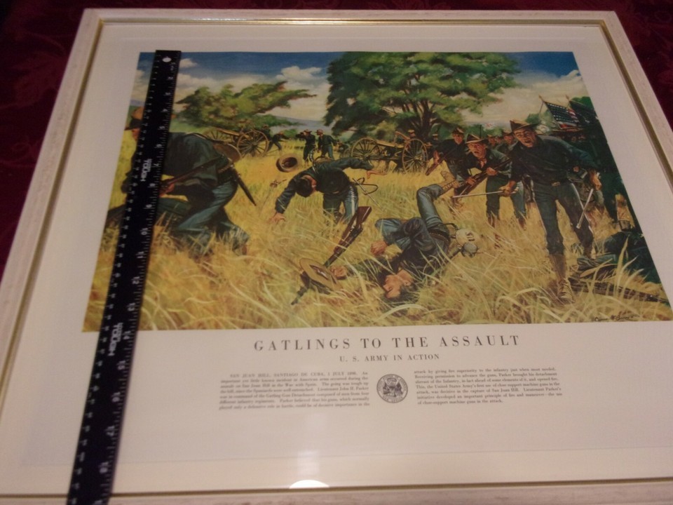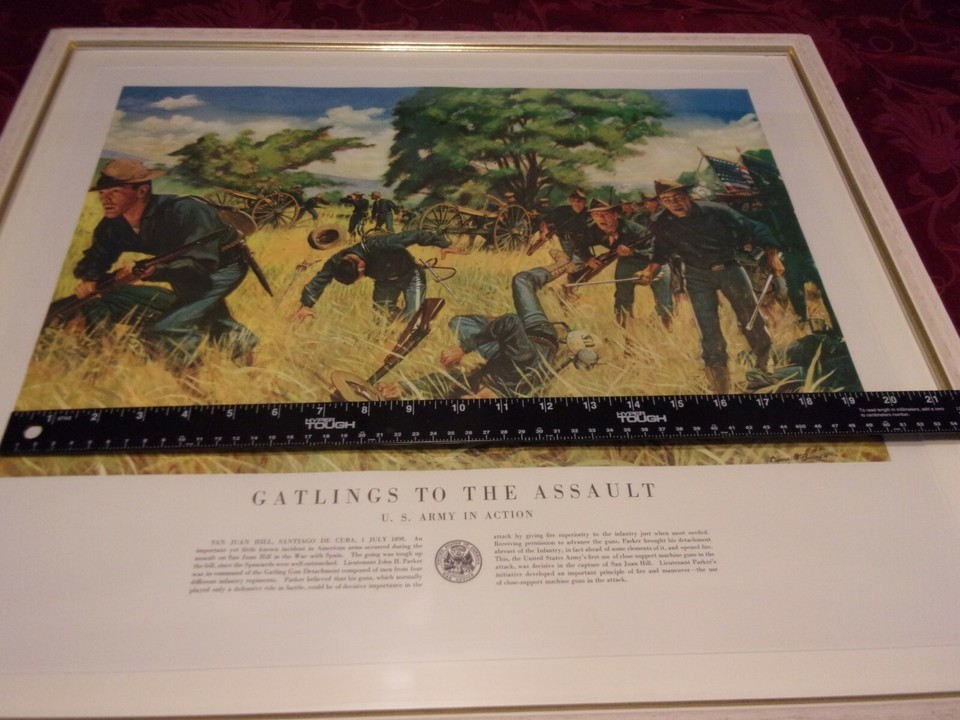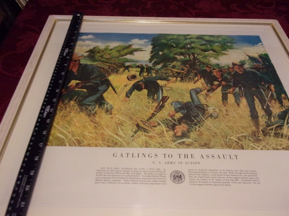 GATLINGS TO THE ASSAULT PRINT IN WHITE WOODEN FRAME FRAMED 23"X 26" US ARMY