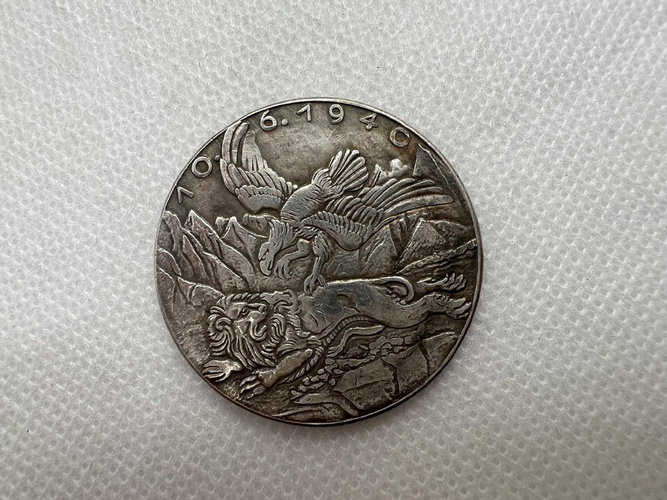 La pieza conmemorativa de la medalla de fantasía General Eduard Dietl - Narvik es una medalla meticulosamente elaborada que rinde homenaje a una de las figuras militares mas importantes de su tiempo. La medalla cuenta con un perfil finamente detallado del general Eduard Dietl, destacando los aspectos intrincados de su rostro junto con la insignia y las insignias en su uniforme. Conocido por su coraje y capacidades estrategicas durante la Segunda Guerra Mundial, particularmente en las batallas del norte de Europa, el general Dietl fue el primer soldado aleman galardonado con la Cruz de Caballero de la Cruz de Hierro durante la guerra, un prestigioso honor militar.