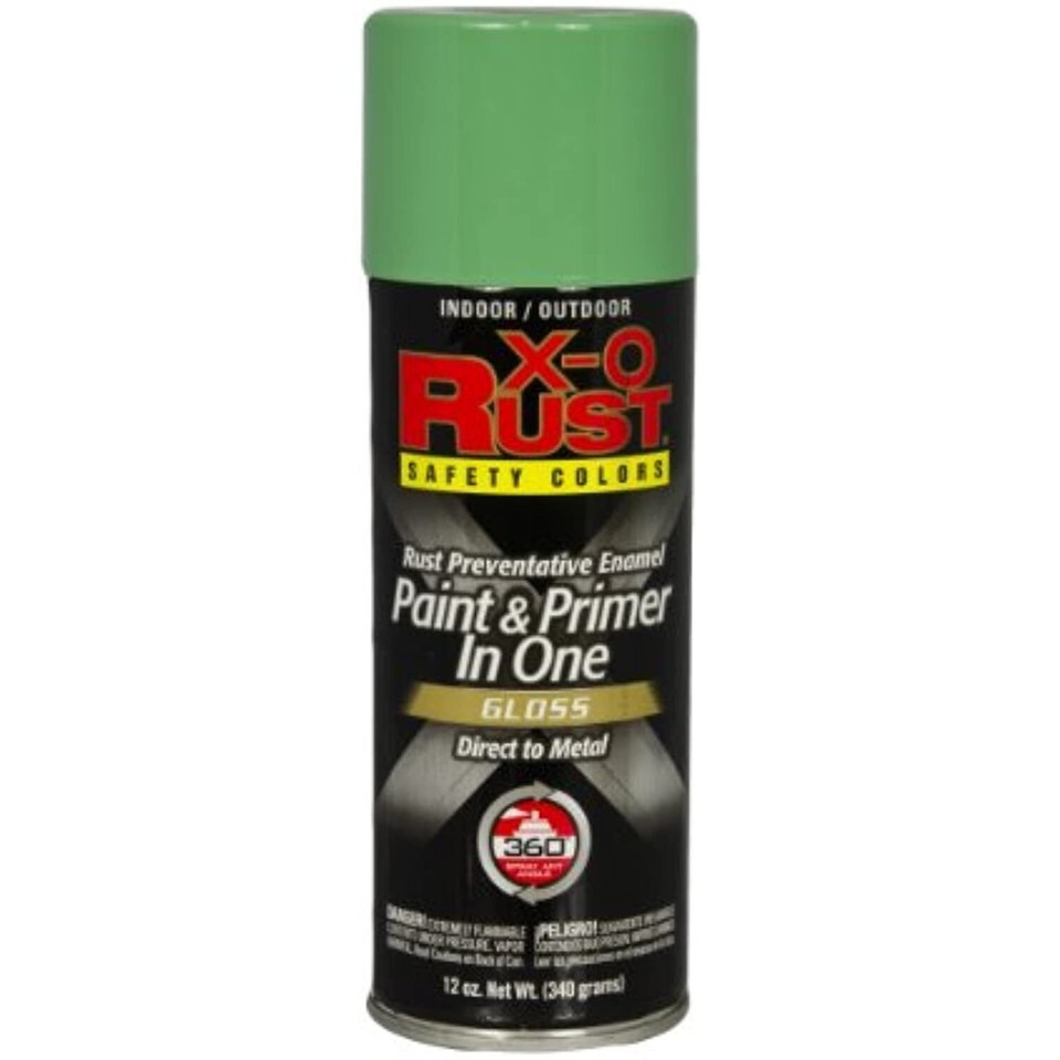 Product Description Xop47, 12 oz spray, gloss safety Green, interior/exterior, professional x-o rust, rust Preventative enamel, direct to metal paint primer in one, Mir 1. 4. From the Manufacturer X-O Rust Professional Safety Colors Paint Primer In One Spray with 360Degree Spray Tip is a rust-preventive primer and paint in one that can be sprayed directly on metal. It dries quickly, improves topcoat adhesion and is for indoor and outdoor use. Innovative 360Degree technology allows you to spray at any angle -- even upside down -- for quick, even coverage. Color: Safety Green. 12-ounce can.