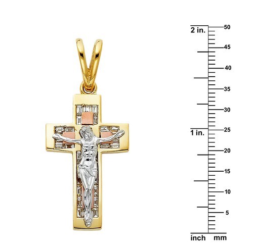 Discover the exquisite beauty of this 14-karat tri-color cubic zirconia pendant, an elegant tribute to the timeless crucifix. The design features a luxurious yellow gold cross adorned with numerous shimmering baguette-cut cubic zirconia, complemented by charming rose gold square accents. At its heart lies a captivating white gold depiction of Christ, radiating faith and devotion.