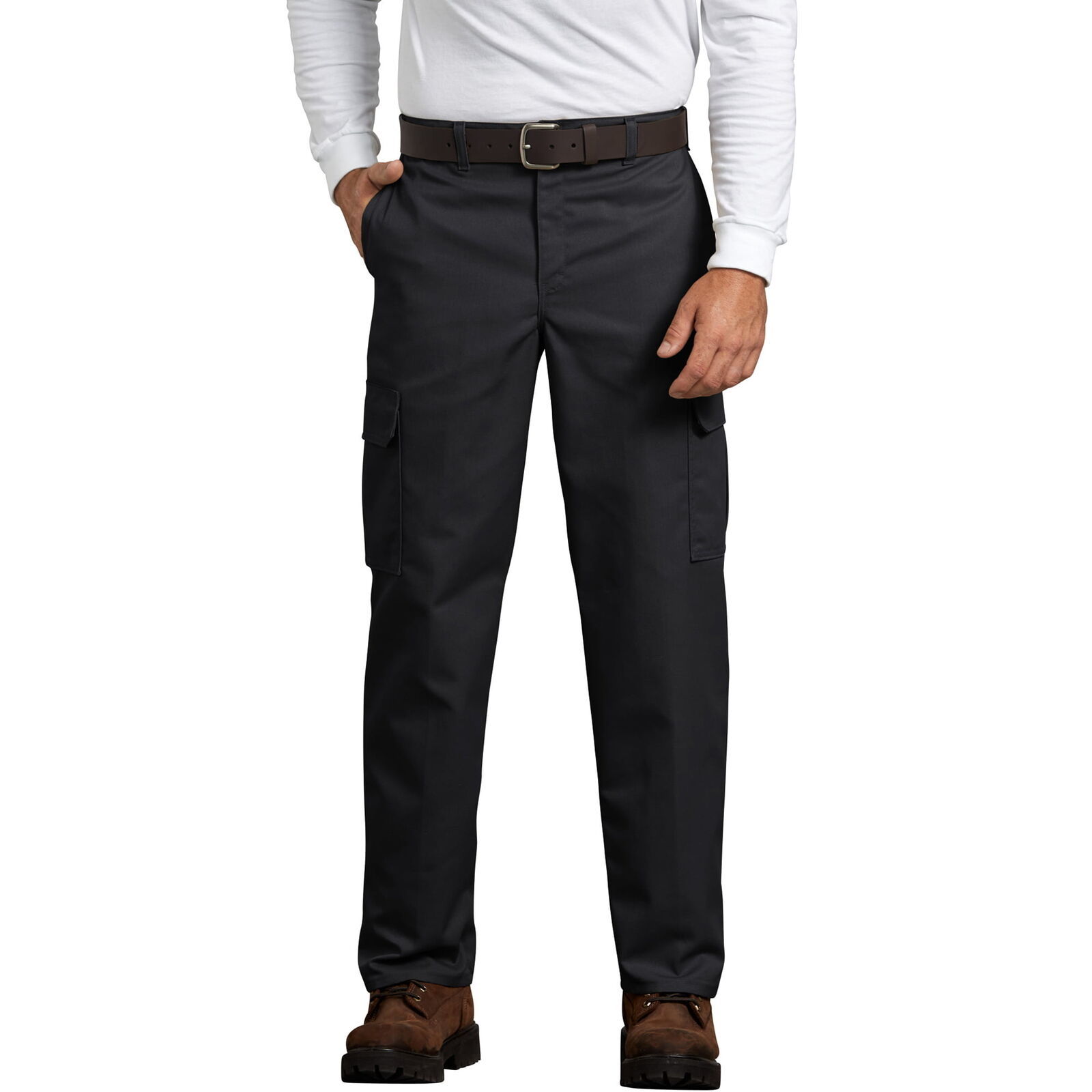 Genuine Dickies Men's Flex Cargo Pant Black Size 44x32 Material: 35.00% Cotton, 65.00% Polyester 7.25 oz. Twill Relaxed fit, straight leg Sits slightly below the waist Flex fabric for ease of movement and comfort Resists wrinkles and fading Tough on stains Moisture wicking Cargo pockets with flaps