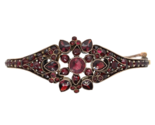 Bohemian garnet bangle bracelet with a beautiful rosette center. The bracelet is made of gilt jeweler's brass. There is a gold filled safety chain. The beautiful rose cut and full cut garnets are a dark red color. The bracelet is an oval shape and fits a size 7.25" wrist. It measures 2 3/8" by 2 1/8" on the interior. The bracelet weighs 10.61 dwt., and dates from the 1880s. Lovely piece! Note: The bracelet is out of round and a little bent. There are some dents, and the safety chain has been added with lead solder. Being offered as-is.