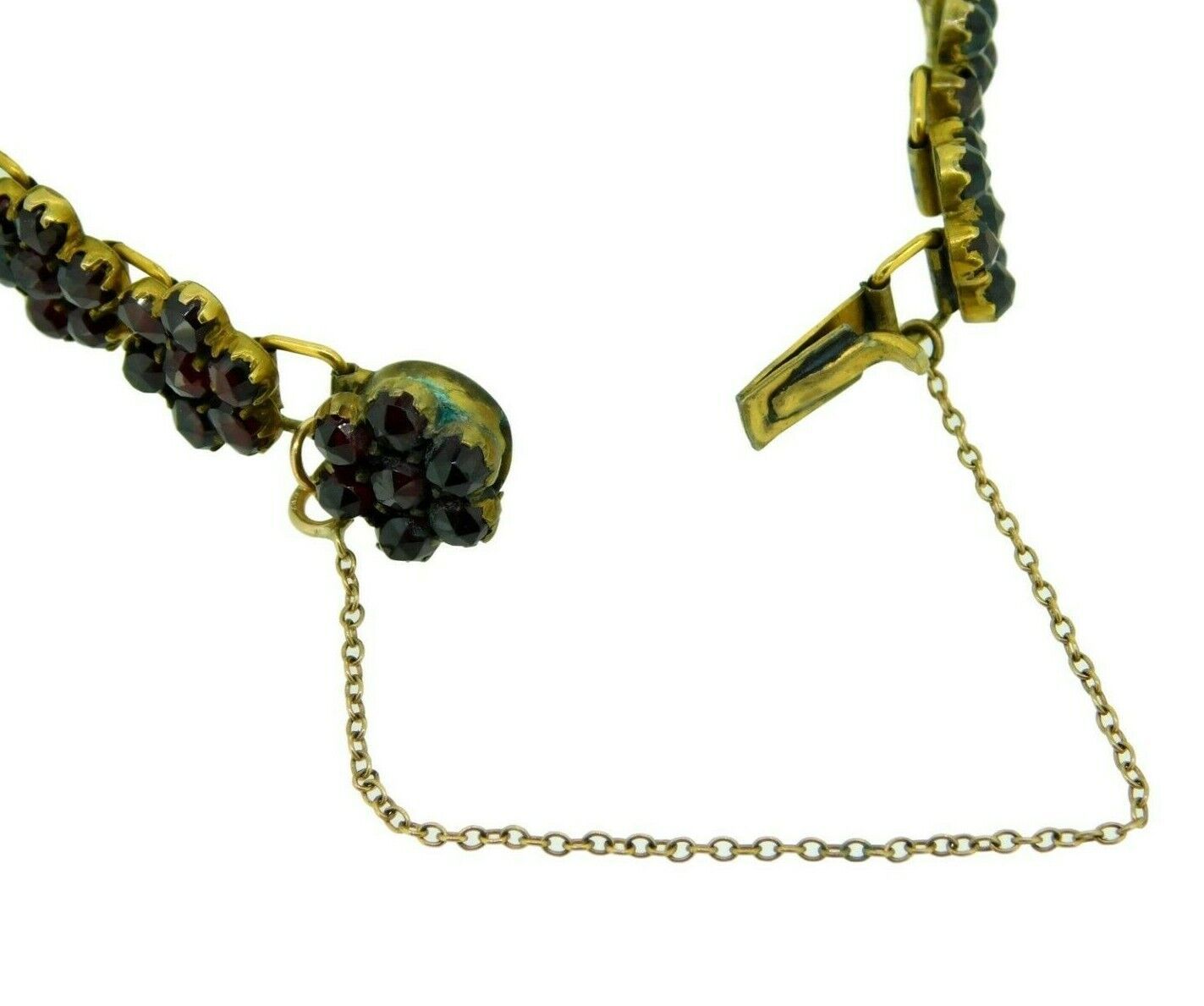 Bohemian garnet link bracelet set in gilt brass with garnet florets or rosettes. It has a gold filled safety chain and measures 6 1/8" long. The rose cut garnets range from 1.7mm to 3.6mm. The bracelet weighs 9.9 dwt., and dates from the 1880's. Beautiful!