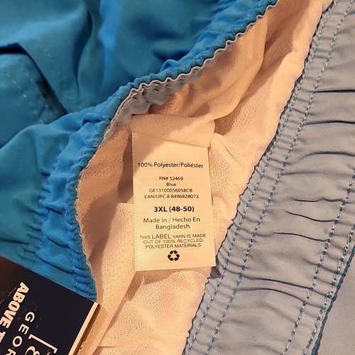 This Sale is for a Pair of GEORGE? Swim Shorts Men's Size 3XL (48/50) BLUE CREEK ~ Colorblock Pattern in Shades of Blue Inseam measures approximately 8" Pull-On Style Elastic Waistband w/Drawstring Relaxed Fit Mesh Liner UPF 50+ Protection Mid Rise Two (2) Side ~ On Seam Pockets ~ Back Pocket w/Velcro Closure 100% Polyester Machine wash ~ Tumble dry Shorts are new with tags Please view photos for a good description of this item Thank you!