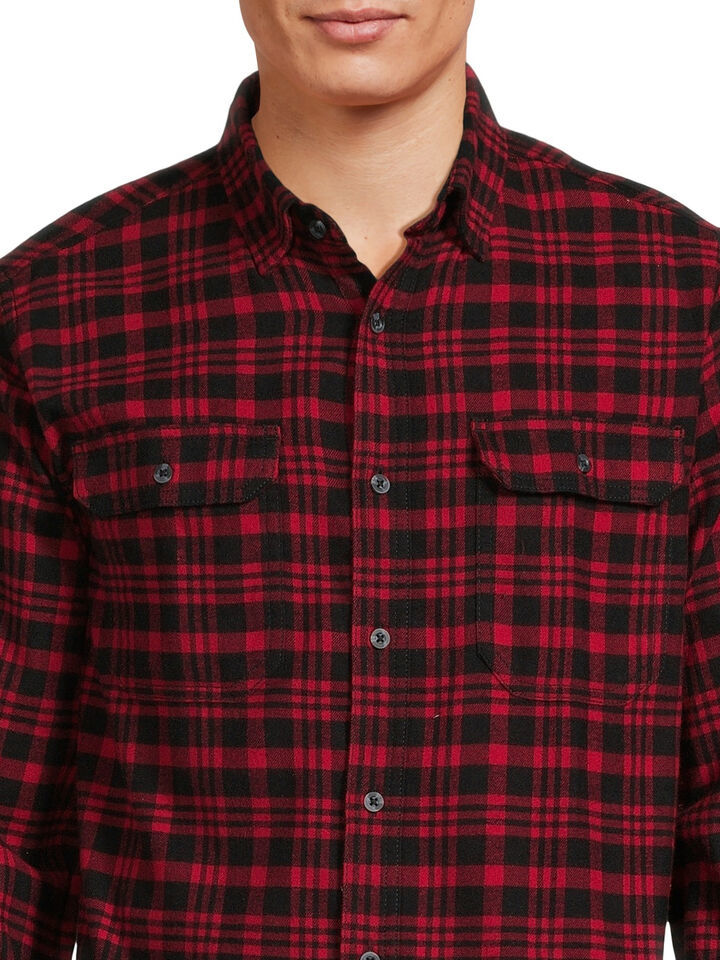 George Men's Long Sleeve Flannel Shirt Black Soot Plaid Size L (42-44) Material: 55% Cotton/45% Viscose Care: Machine washable Size: Model is 6'1'' and is wearing size L Fit: Relaxed Neckline: Point collar Closure: Button front Sleeves: Long sleeves Pockets: Two pockets at chest with button closure Features: Soft fabric for comfort; allover print Long Sleeve Flannel Shirt for Men from George