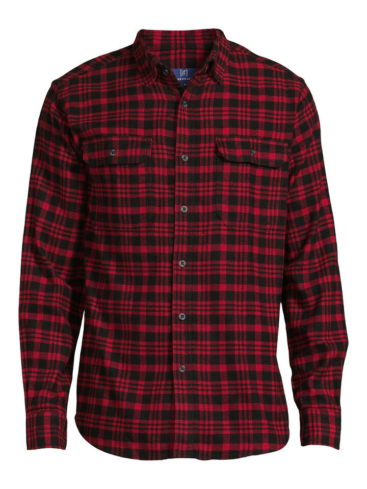 George Men's Long Sleeve Flannel Shirt Black Soot Plaid Size M (38-40) Material: 55% Cotton/45% Viscose Care: Machine washable Size: Model is 6'1'' and is wearing size M Fit: Relaxed Neckline: Point collar Closure: Button front Sleeves: Long sleeves Pockets: Two pockets at chest with button closure Features: Soft fabric for comfort; allover print Long Sleeve Flannel Shirt for Men from George