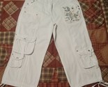 This sale is for one (1) Georgiou Studio Brand Capri Pants Women's Size 2 Measures approximately 14" across waist ~ laying flat Measures approximately 19" across hip area ~ laying flat Rise measures 9.5" Inseam measures approximately 20" White in color 100% Cotton Two (2) front pockets ~ left pocket beaded design Two (2) change pockets on right hand side ~ one (1) has a snap closure One (1) cargo ~ snap closure ~ pocket on left side Two (2) cargo ~ snap closure ~ pockets on right side Two (2) back pockets ~ snap closure ~ right pocket beaded design Tie closure @ bottom of hemline Belt loops around waistband One (1) button zipper closure Capris are in good ~ pre-owned condition Please view photos for a good description of this item Thank you!