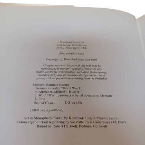 German Aircraft of World War 2 in colour by Kenneth Munson (1978, hardcover) Excellent pre-owned condition. Stored in plastic sleeve cover. Please see photos as they are part of description and you will receive exact item as pictured. Thanks so much for stopping by! Let us know if you have any questions or need any additional images. Please take a look at our other vintage treasures and cool finds in the store! If you find a number of things you are interested in, please let us know and we will gladly combine shipping where we can*! *cannot combine shipping through the Global Shipping Program or with certain unique or fragile items Please note that we always try to reuse and recycle packing materials whenever possible Please message us first before leaving us neutral or negative feedback. Our aim is 100% customer satisfaction we can always create a positive resolution for any dissatisfied customer, Thank you kindly.